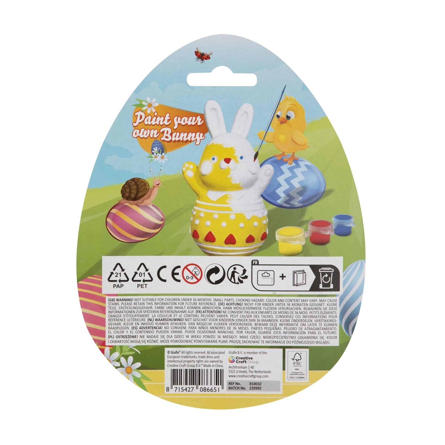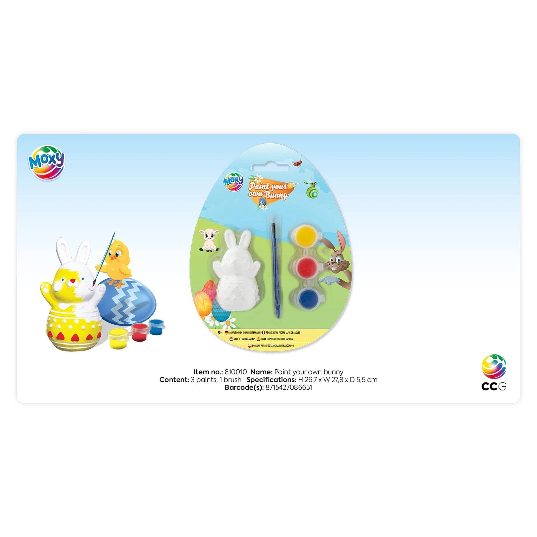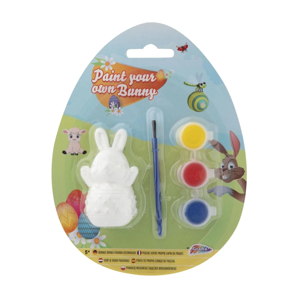 Комплектът включва фигурка на заек, четка и три основни цвята бои – жълто, червено и синьо.
