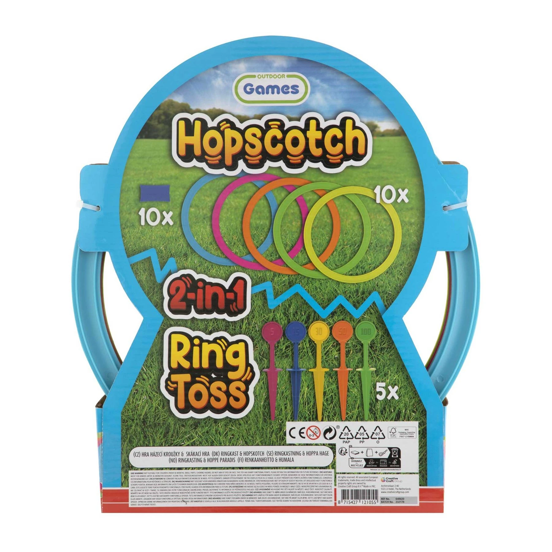 Играта съдържа: 5 пинчета, 10 обръча и 10 лепенки за закрепяване на обръчите.