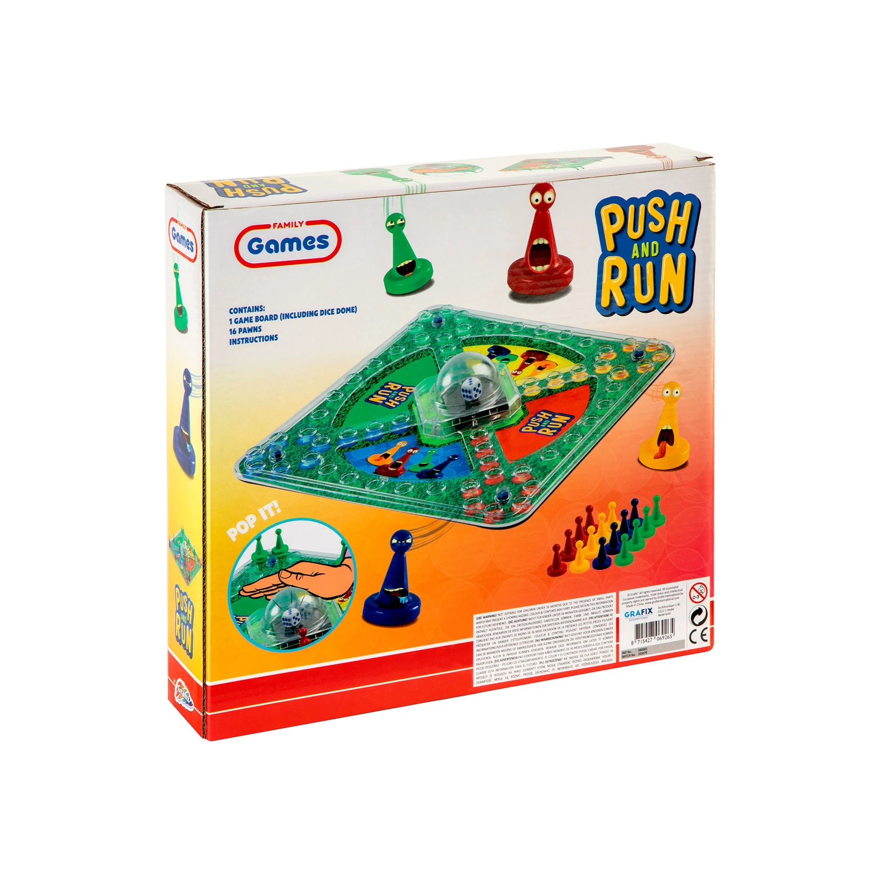 Опаковката съдържа борд със зарче, 16 пионки и инструкции.