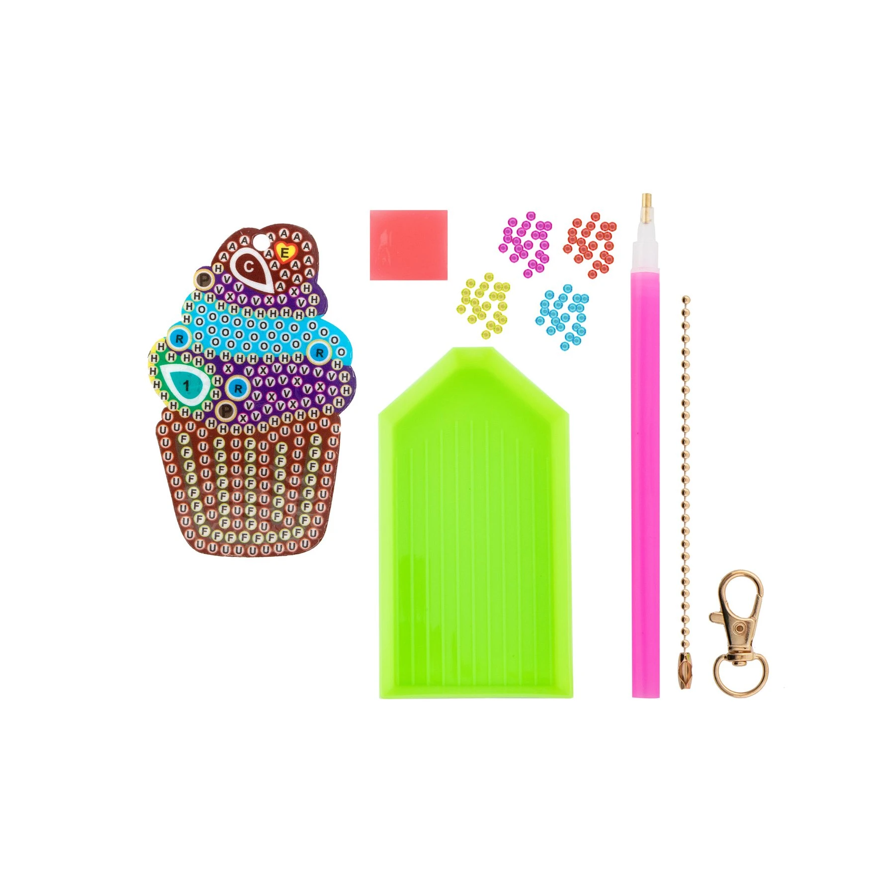 Комплектът съдържа: - фигурка на къпкейк с възможност за залепване на мъниста; - мъниста; - апликатор за залепяне на мъниста; - 1 брой карабинер; - 1 брой верижка; - основа за редене; - спомагателна тавичка.