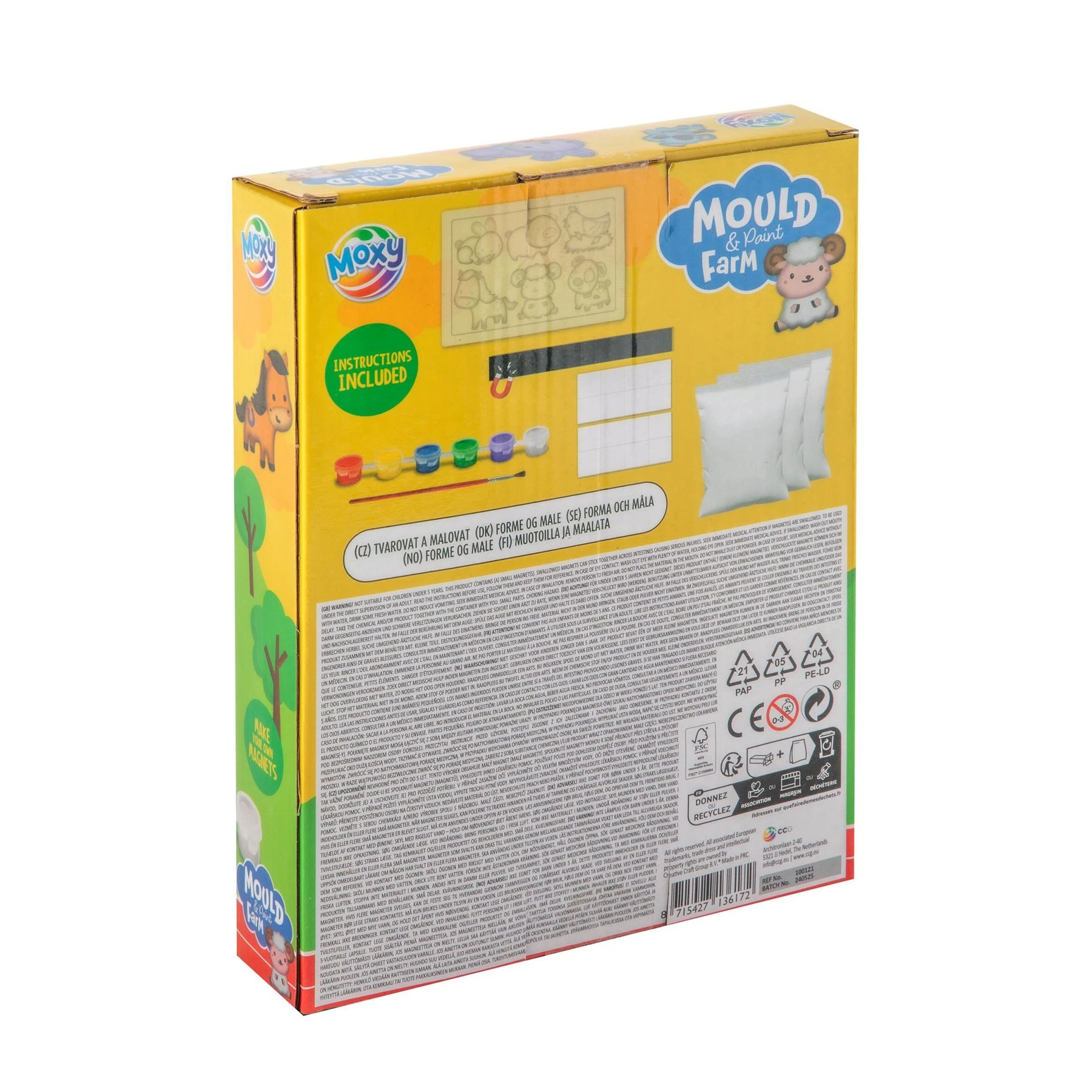 С този творчески комплект децата могат сами да направят и оцветят сладки гипсови фигурки на животни от фермата. Просто пригответе гипсовата смес, изсипете я във формата, изчакайте да стегне и след това оцветете фигурките с включените бои. Накрая можете да ги превърнете в магнити или декоративни фигурки с помощта на приложените аксесоари.