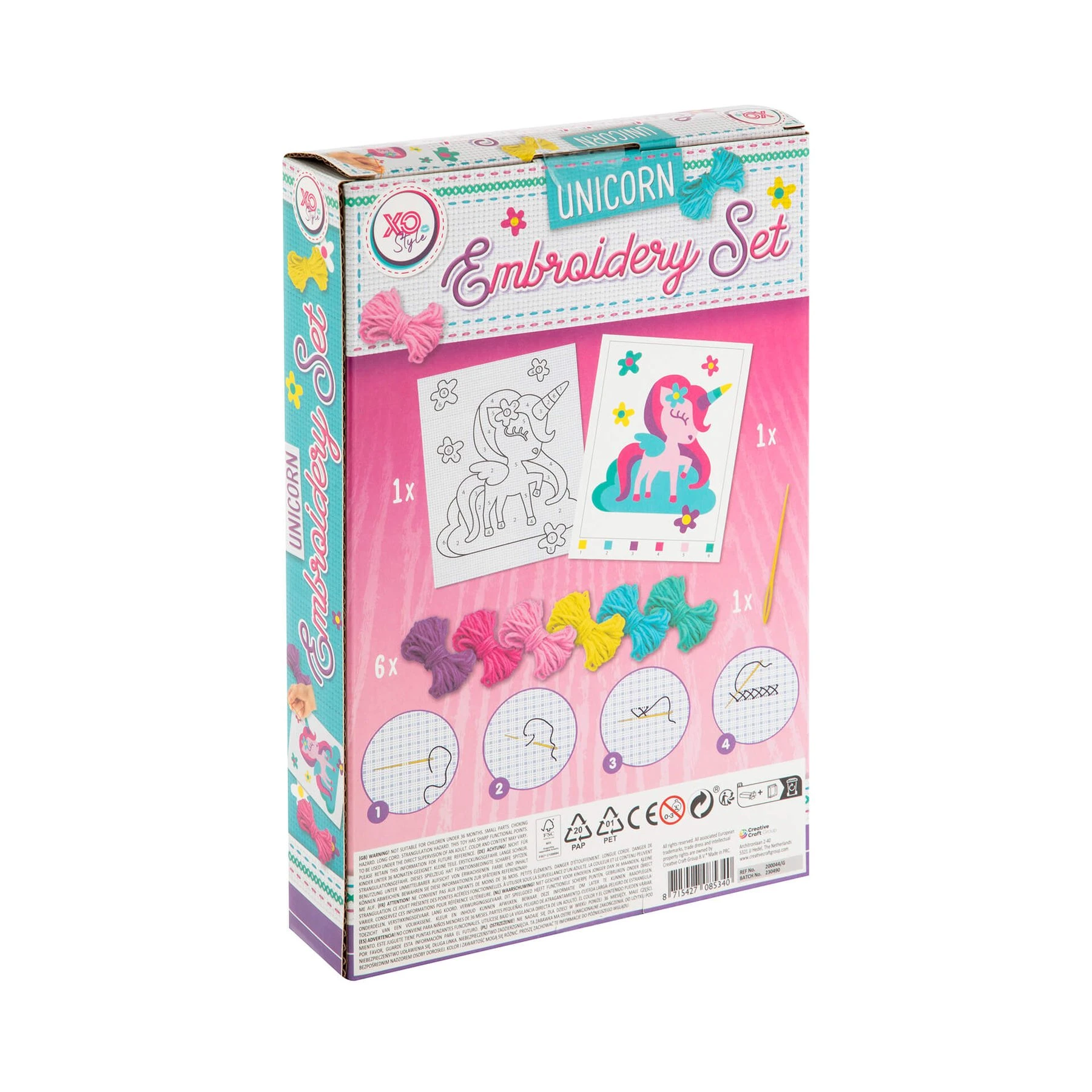 Комплектът включва: - картина за бродиране с еднорог; -пластмасова игла; -6 цветни конеца.