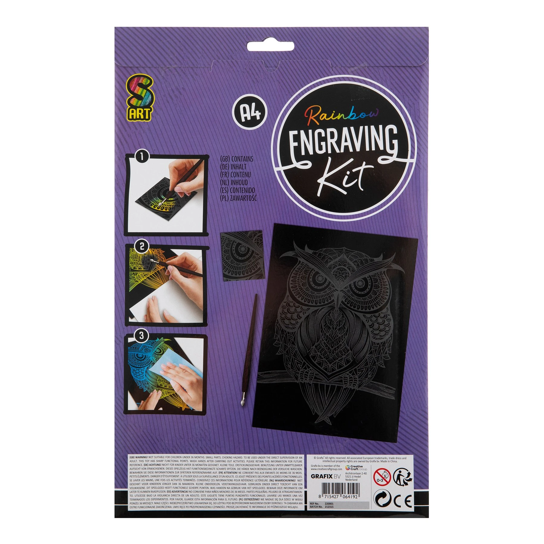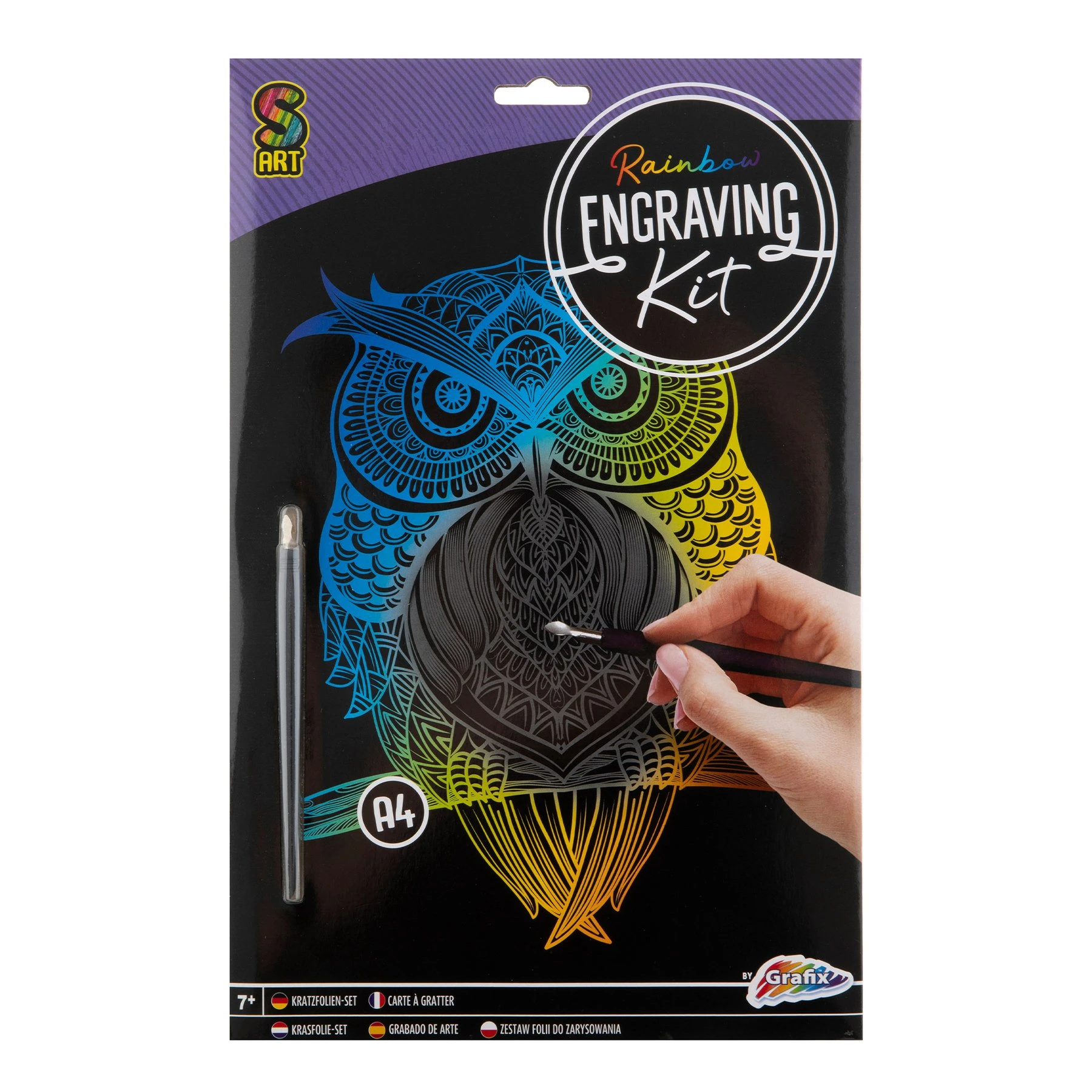 – изображение за издраскване с илюстрация на разноцветен бухал, формат А4;