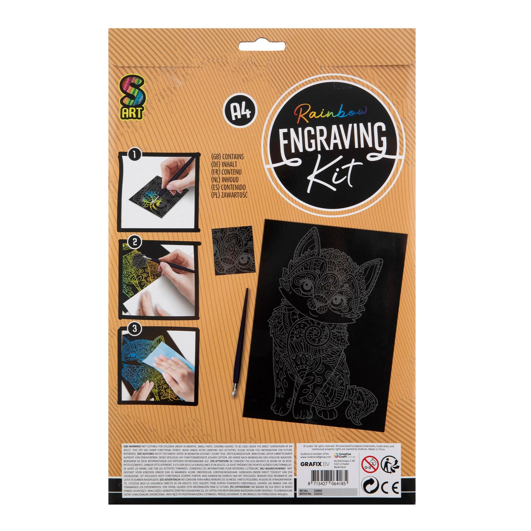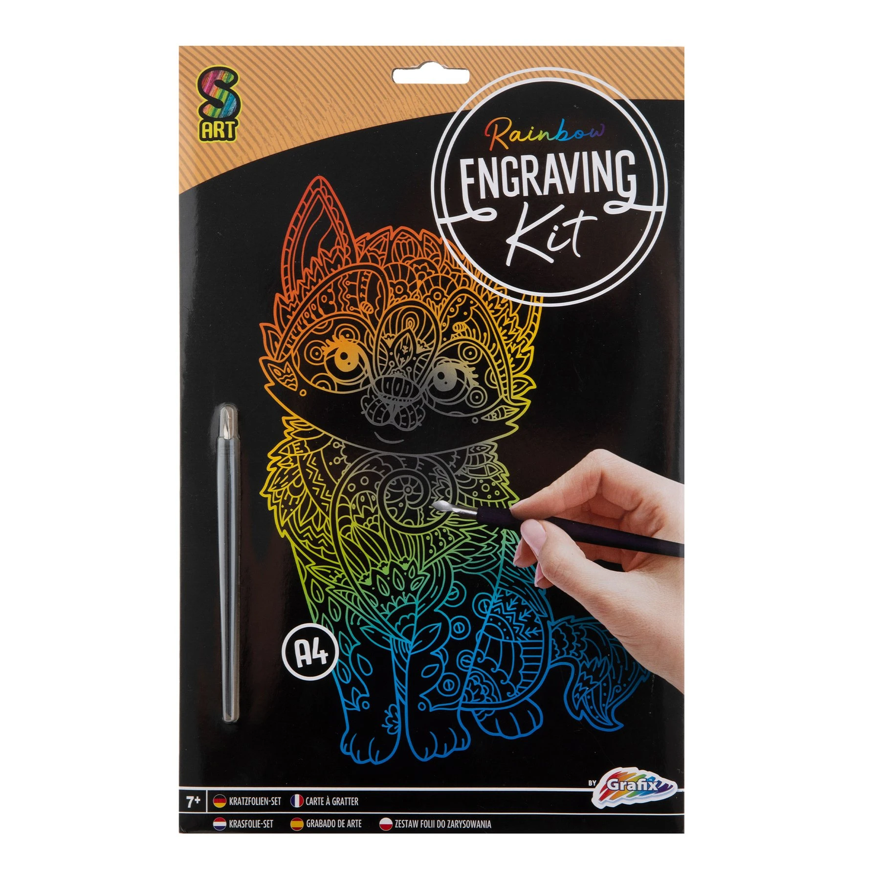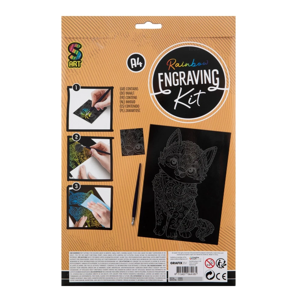 – изображение за издраскване с илюстрация на разноцветно коте с орнаменти, формат А4;