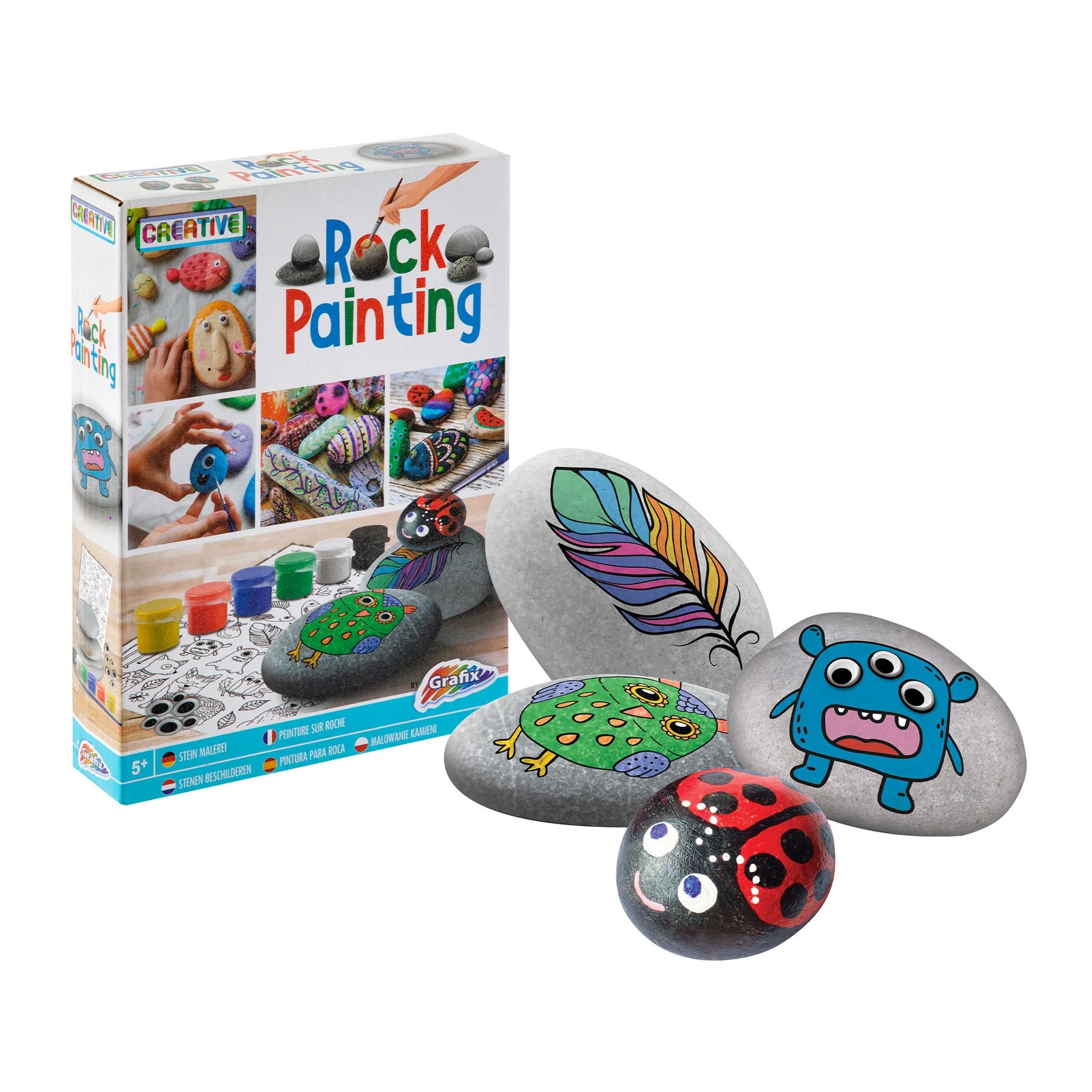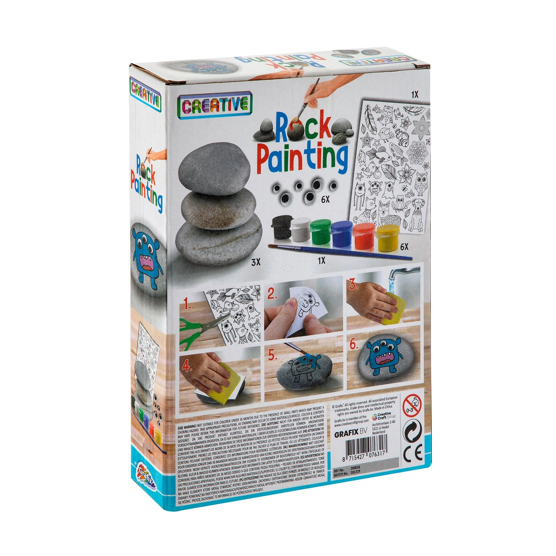 Комплектът включва 3 камъка за рисуване, 6 цветни бои и четка, 6 лепящи мърдащи се очички и стикери за оцветяване.