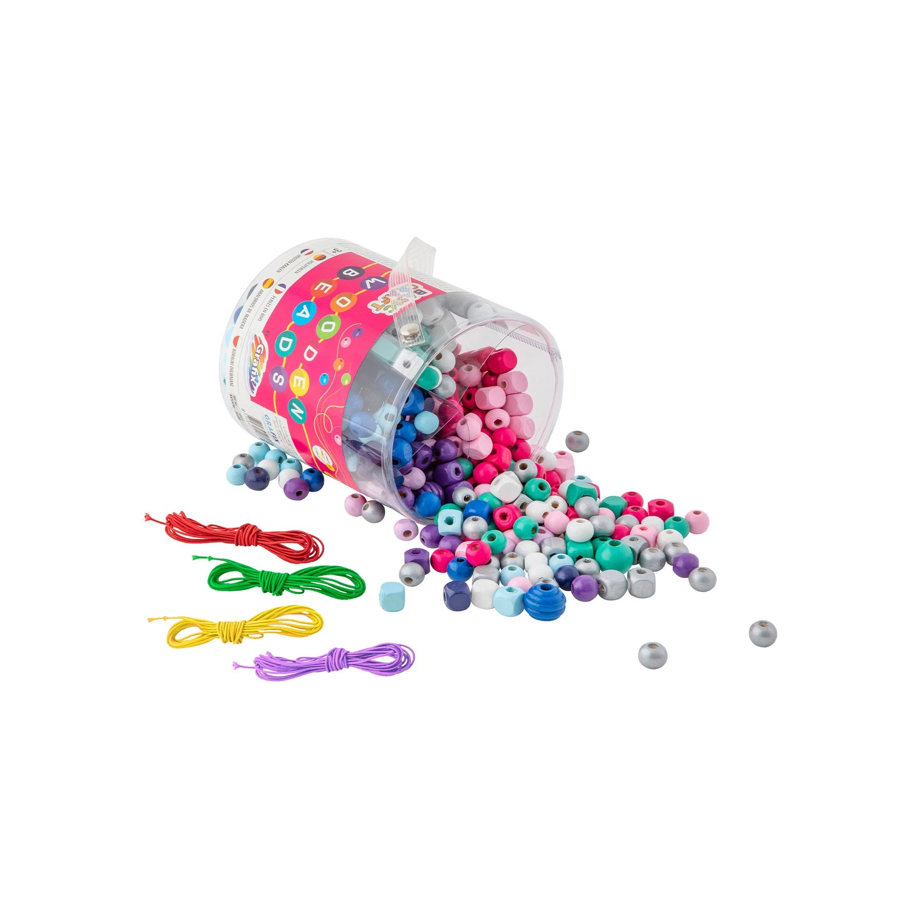 Кутия с различни цветове дървени маниста и 4 връзки.