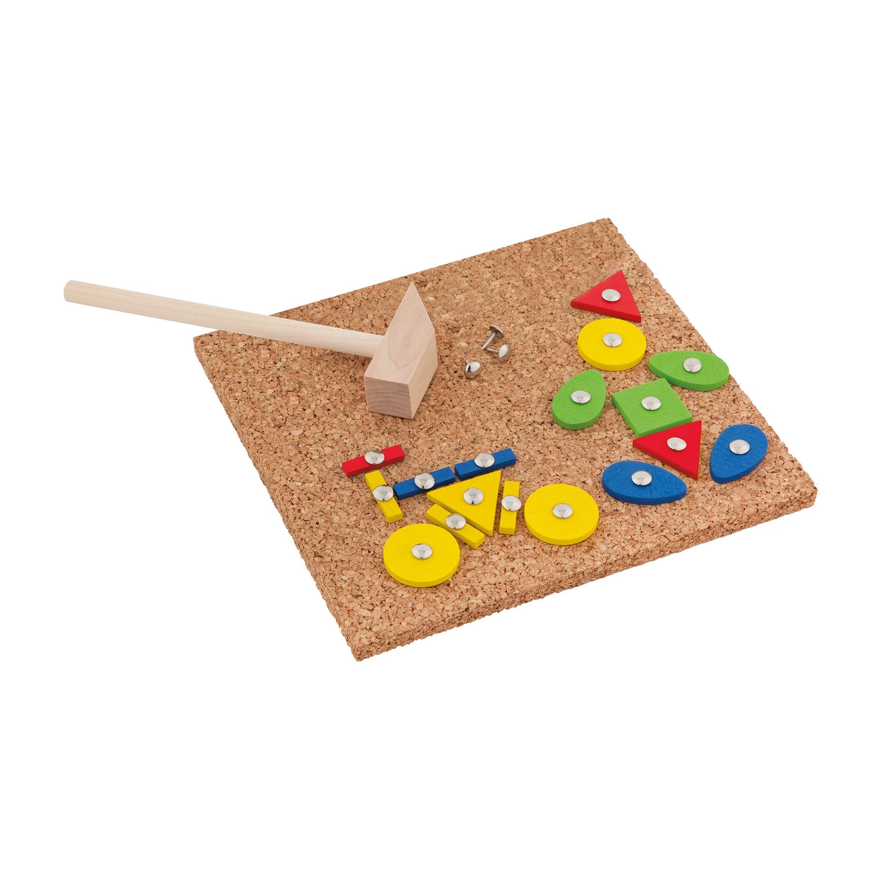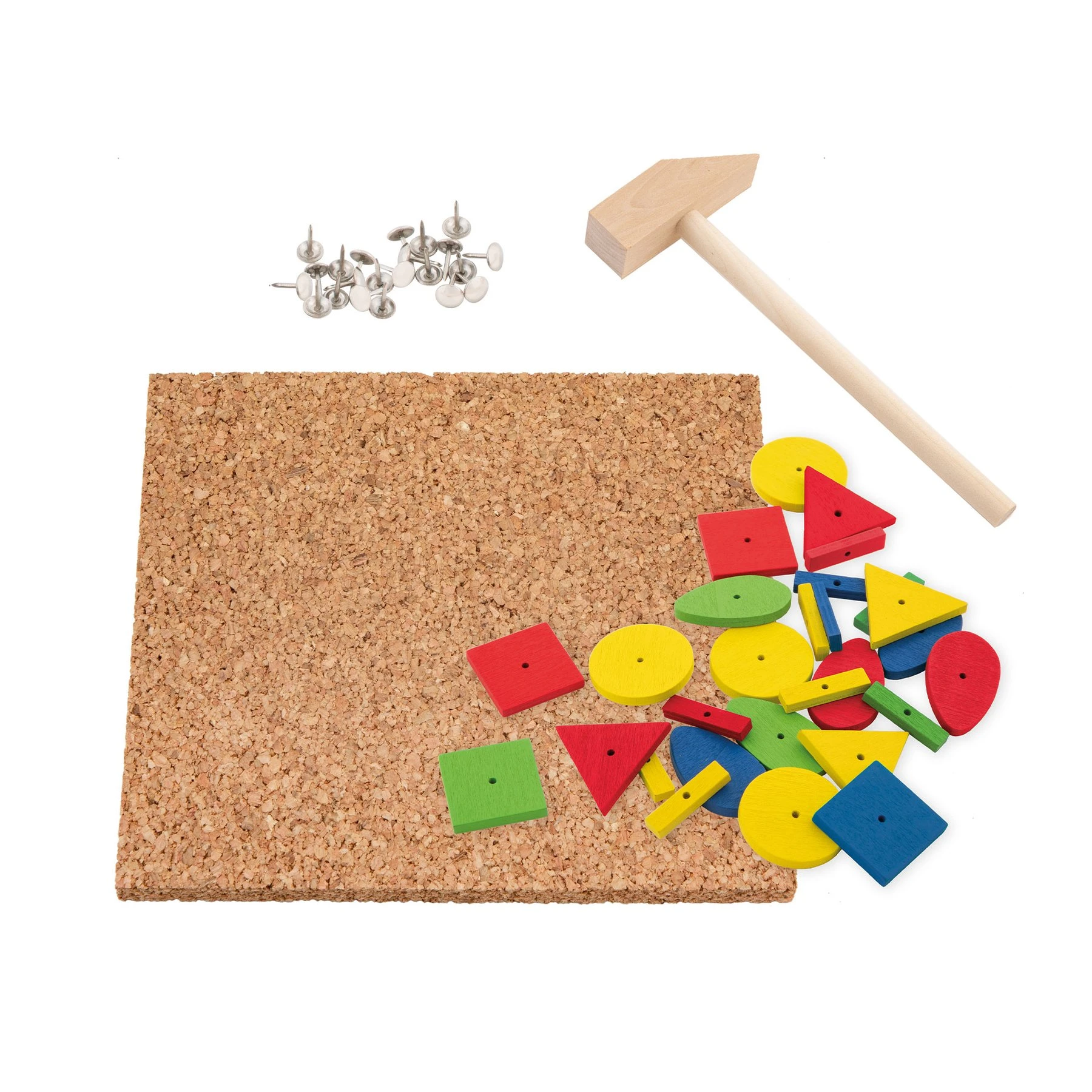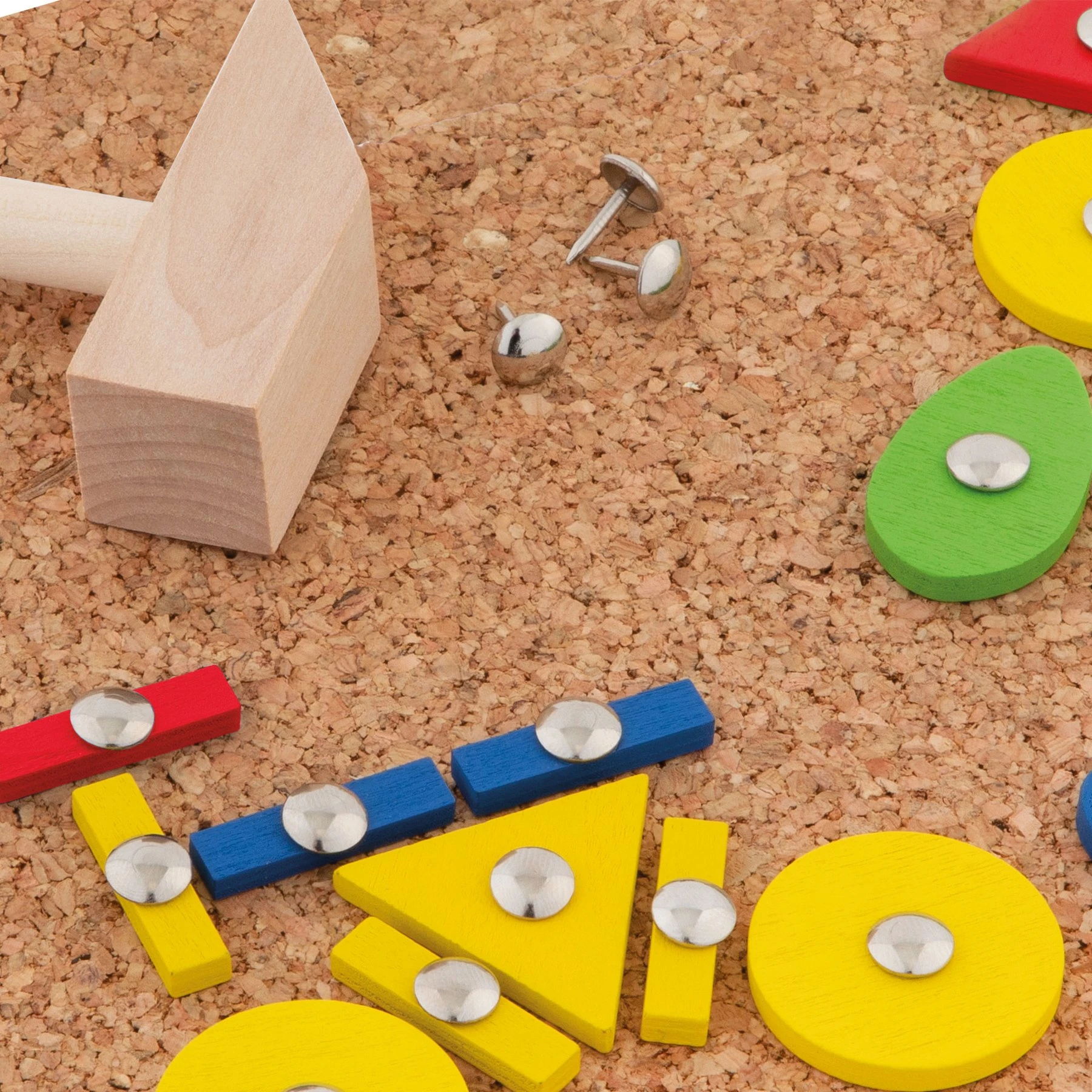 Комплект от дървена мозайка с габърчета, коркова дъска и дървено чукче.