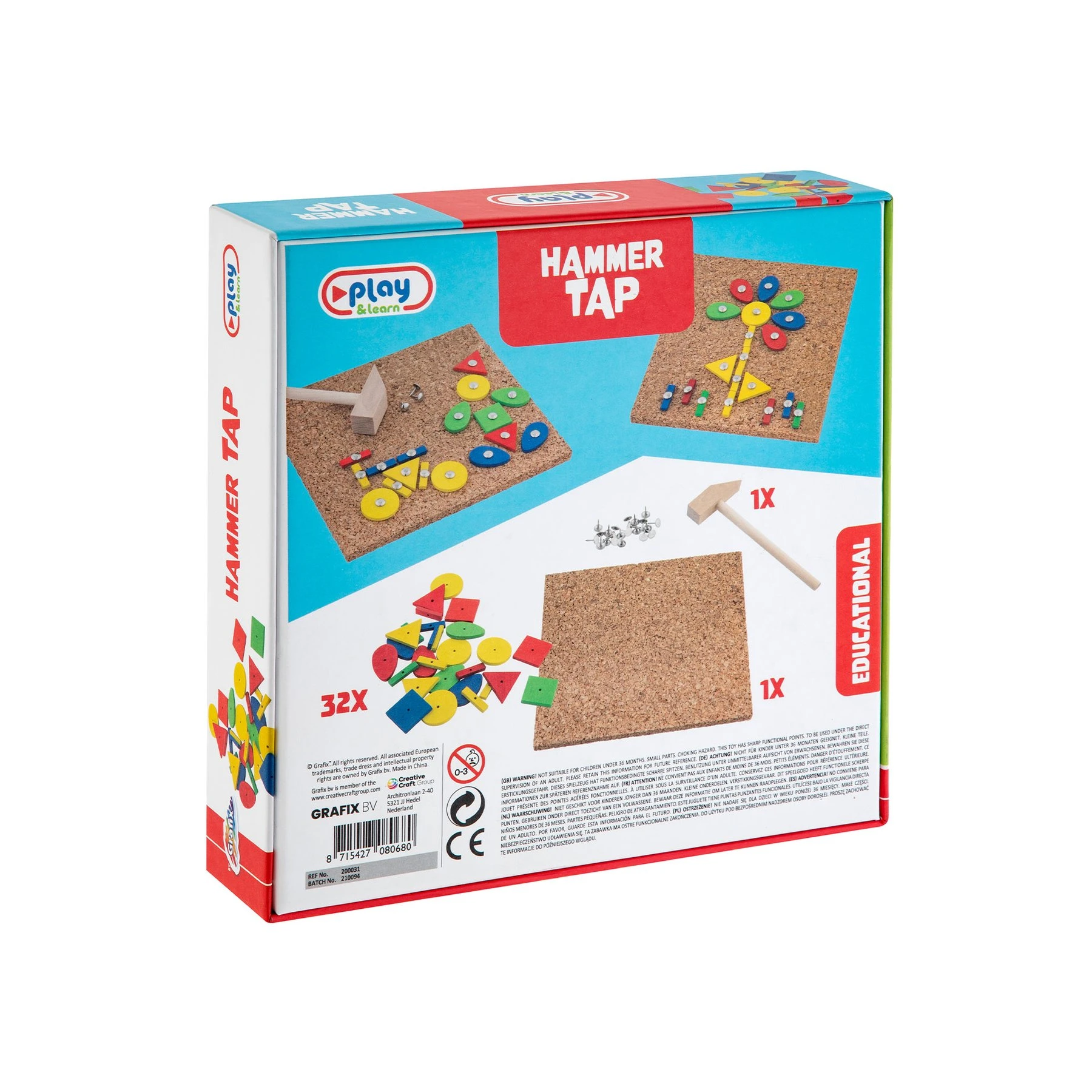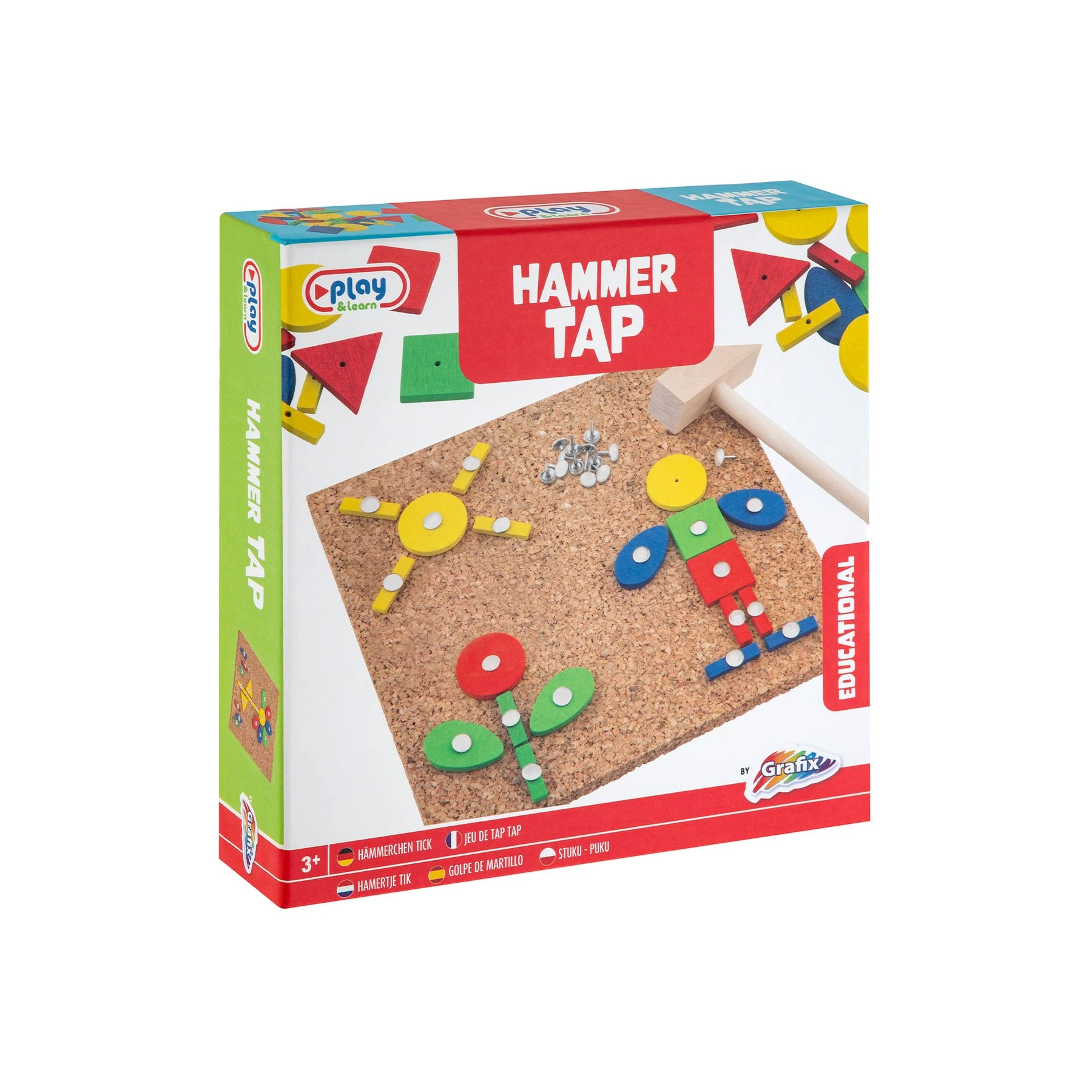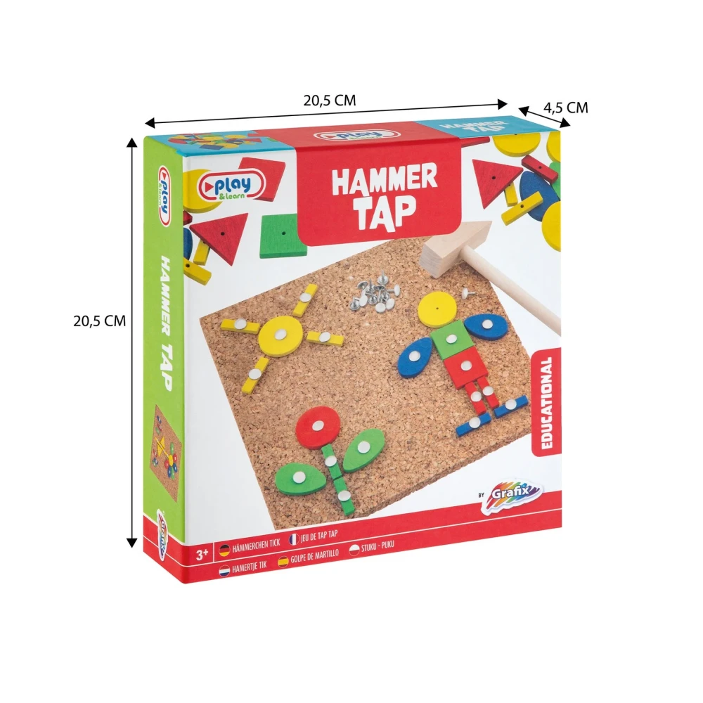 Комплект от дървена мозайка с габърчета, коркова дъска и дървено чукче.