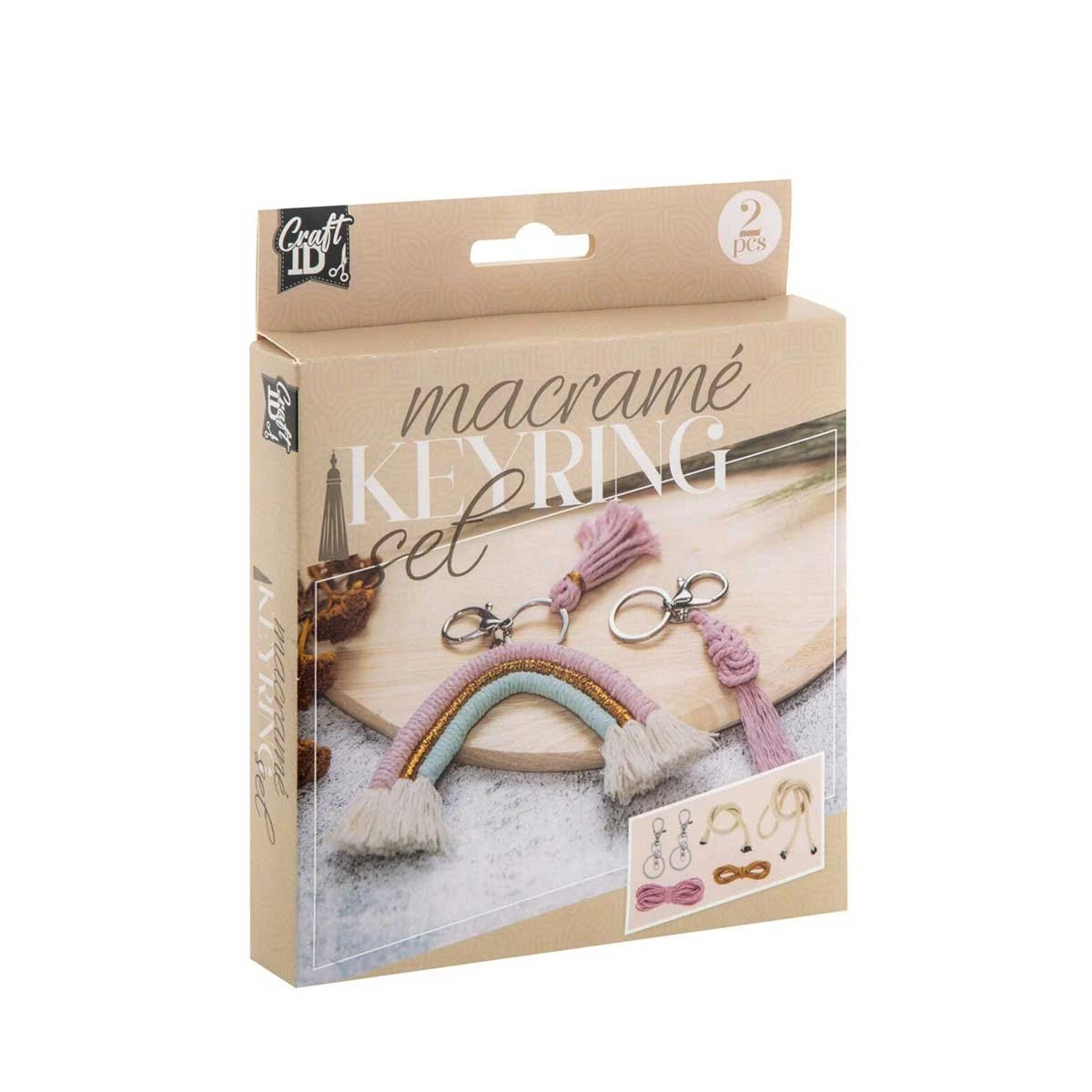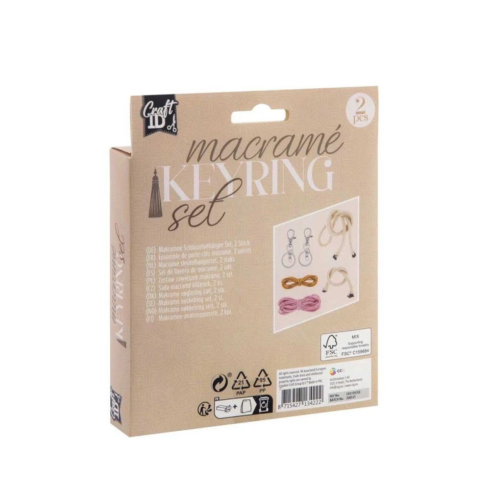 Комплектът включва: - шнур за макраме, розов - 4.8 m; - шнур за макраме, натурален - 3.5 m; - шнур за макраме, син - 1 m; - златиста връв - 3.2 m; - 2 въжета; - 2 сребристи ключодържателя с размери 6.5 х 3 cm; - инструкции.