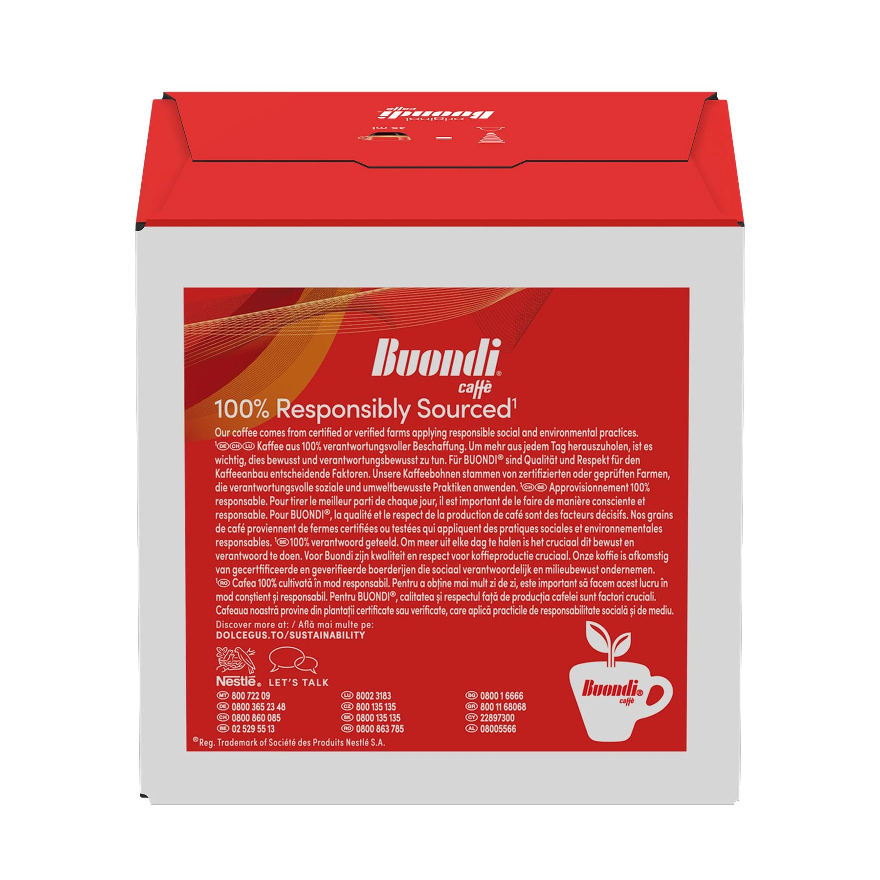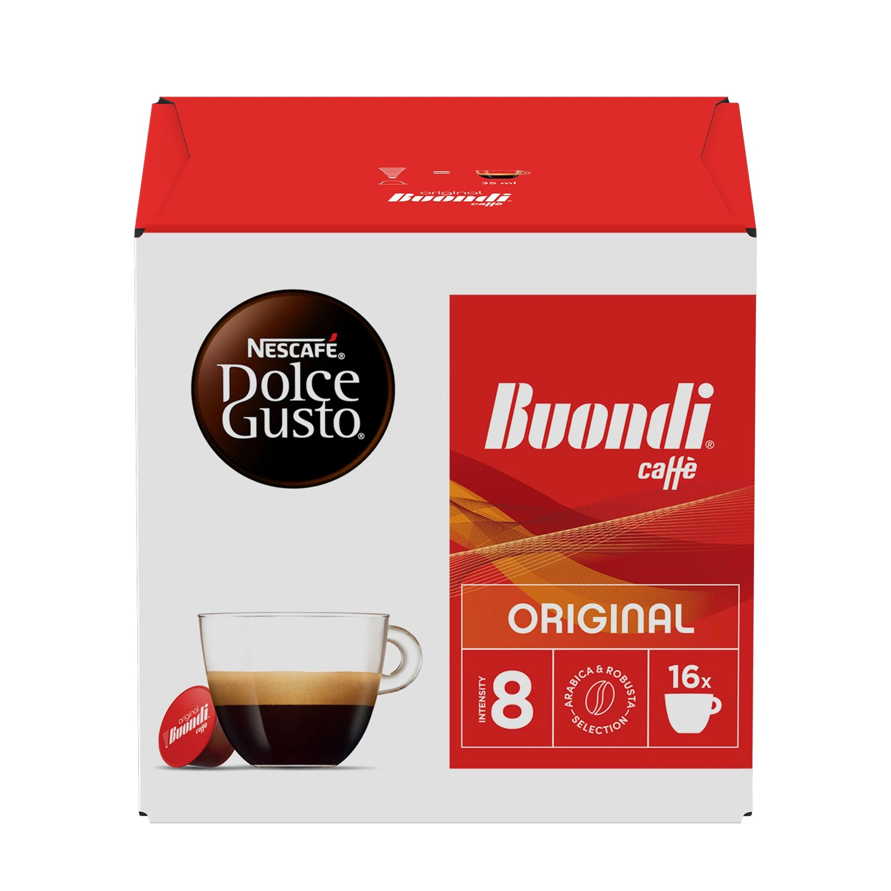Открий NESCAFE® Dolce Gusto Espresso Buondi® - късо кафе (35 ml) с плътно тяло, постигнато чрез майсторско съчетаване на сортовете Арабика и Робуста. Наслади се на долавящите се нотки на лешник и черен шоколад.