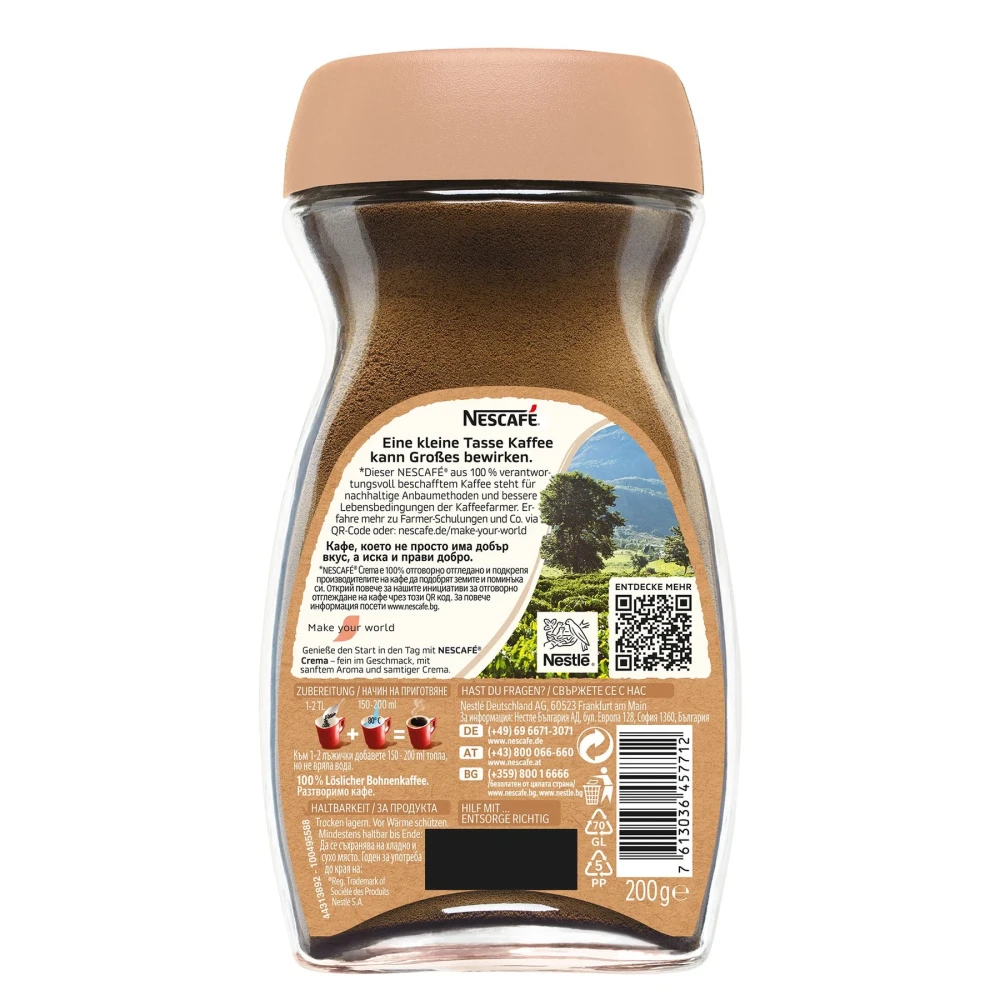 NESCAFE® Crema е гладко и копринено кафе, направено от внимателно подбрани кафе зърна Робуста, експертно изпечени светло, което осигурява преживяването да се насладиш на разтворимо кафе със силен аромат и изкусителен каймак за още по-приятно кафе изживяване на сутрешните моменти. Приготвя се лесно и бързо само с гореща вода.