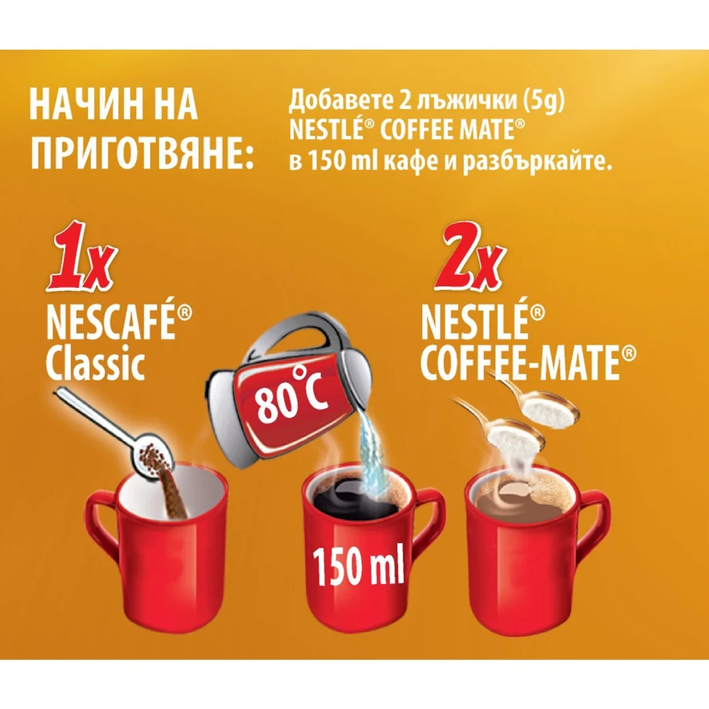 Добави 2 лъжички NESTLE® COFFEE-MATE® към твоята кафе напитка за мигновен златист цвят и се наслади на нежния вкус на любимото ти кафе.