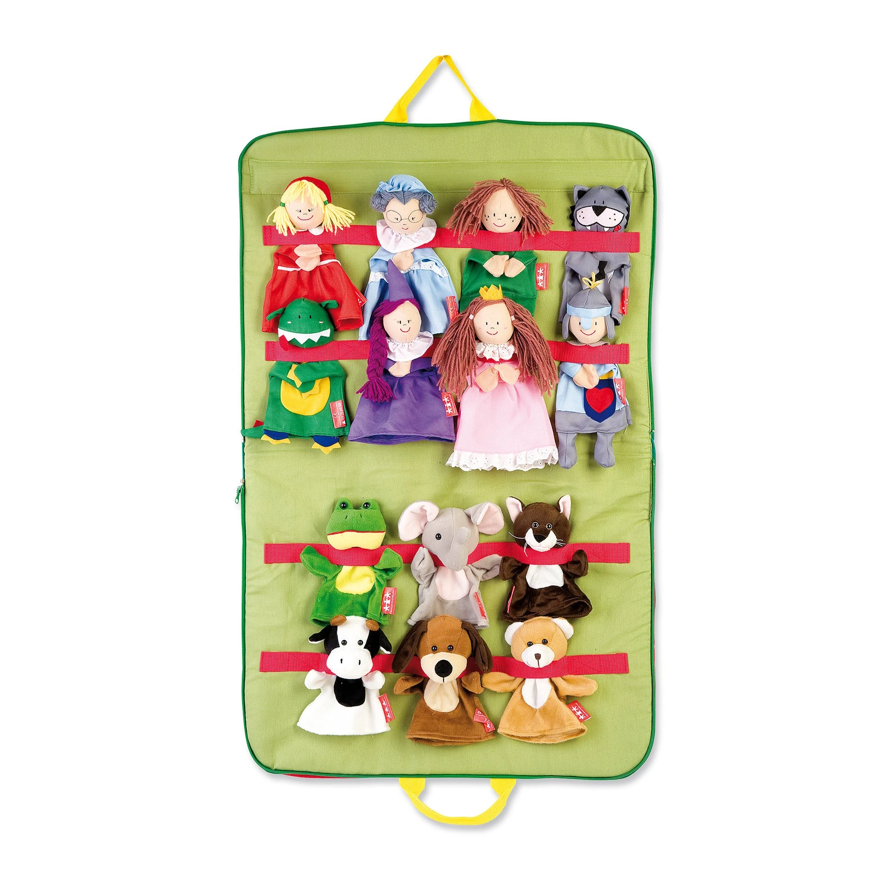 Комплектът включва кукли: червената шапчицата, бабата, ловецът, вълкът , дракон, принцеса, фея, рицар, жаба, слон, котка, крава, куче, мечка;