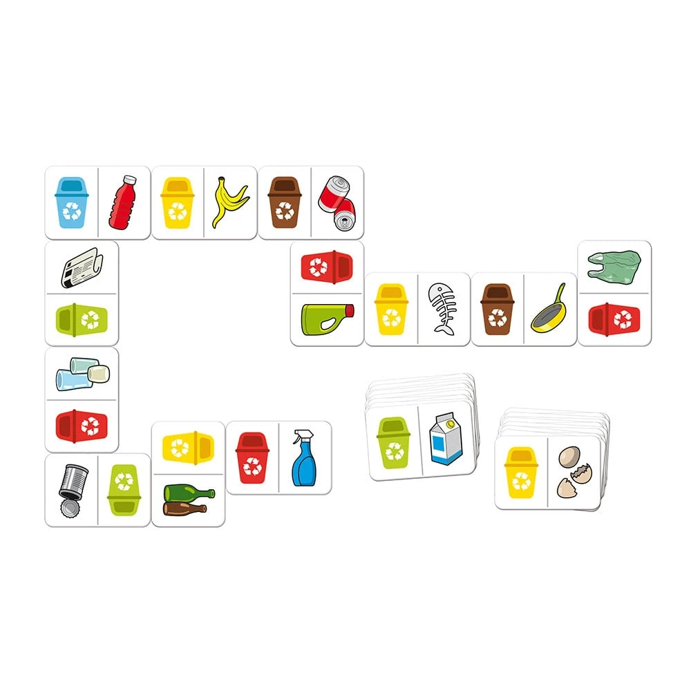 Включва 25 плочки (6 х 8.6 cm), представляващи кошчета за отпадъци (зелено за стъкло, синьо за хартия, жълто за пластмаса, кафяво за органични отпадъци) и илюстрации на различните видове отпадъци.