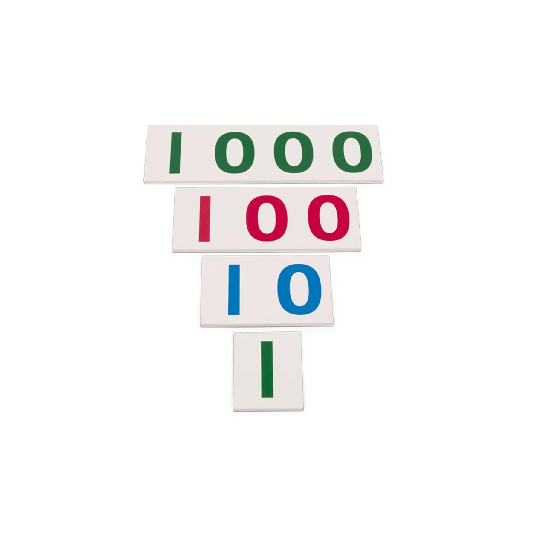 Съдържание: - 1 карта с единици; - 1 карта с десетици с размери 7 x 0,5 x 5,5 cm; - 1 карта със стотици с размери 11 x 0,5 x 7 cm; - 1 x карта с хиляди с размери 16,5 x 0,5 x 7 cm.