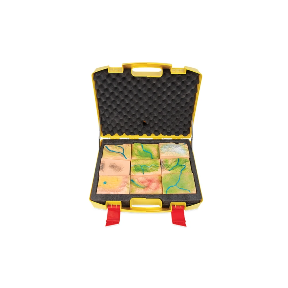 Комплектът позволява на учениците да разучават планините, платата, равнините, хълмовете, реките и океаните.