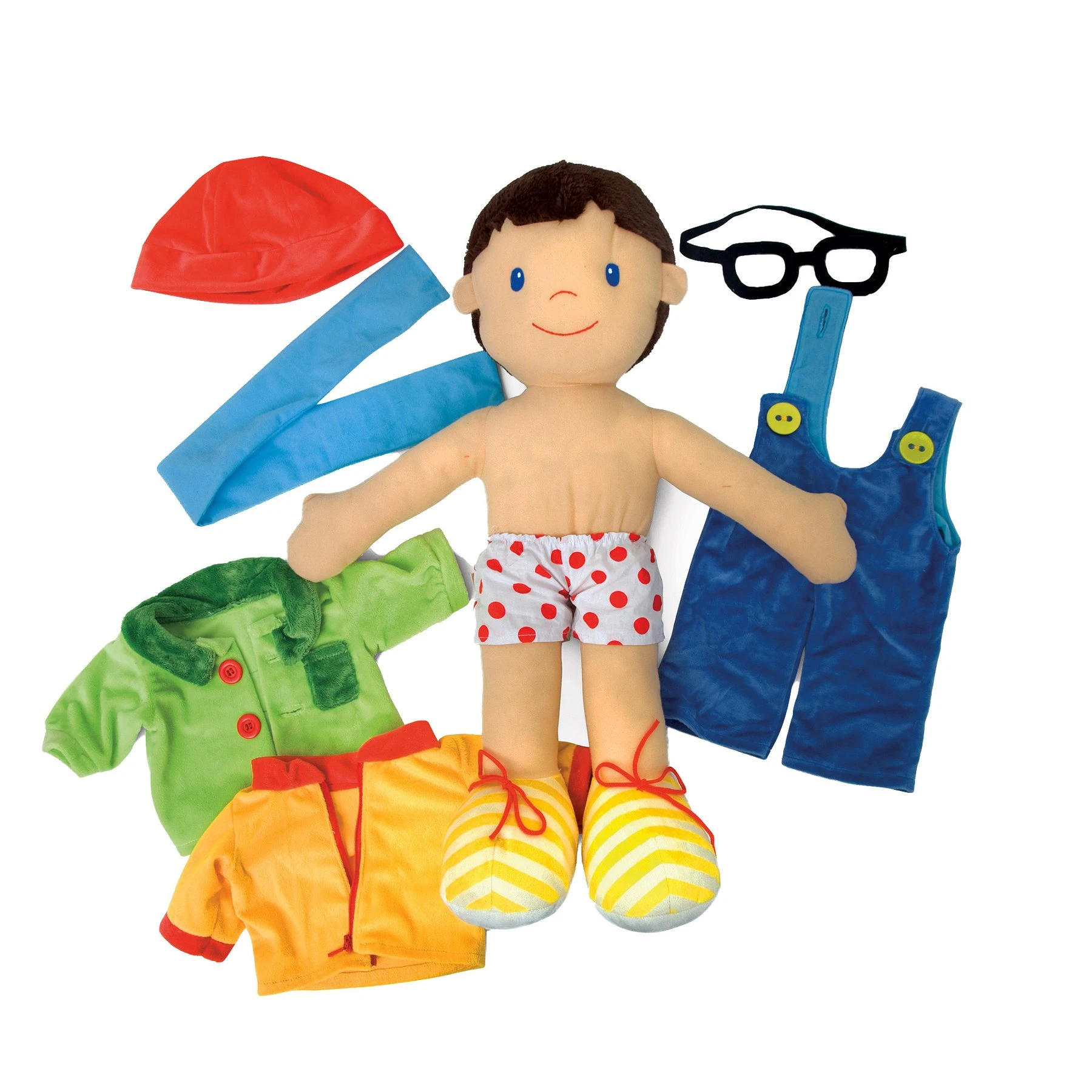 Големи меки кукли, облечени в няколко слоя дрехи (дървени и пластмасови копчета, велкро, ципове, дантели и катарами).