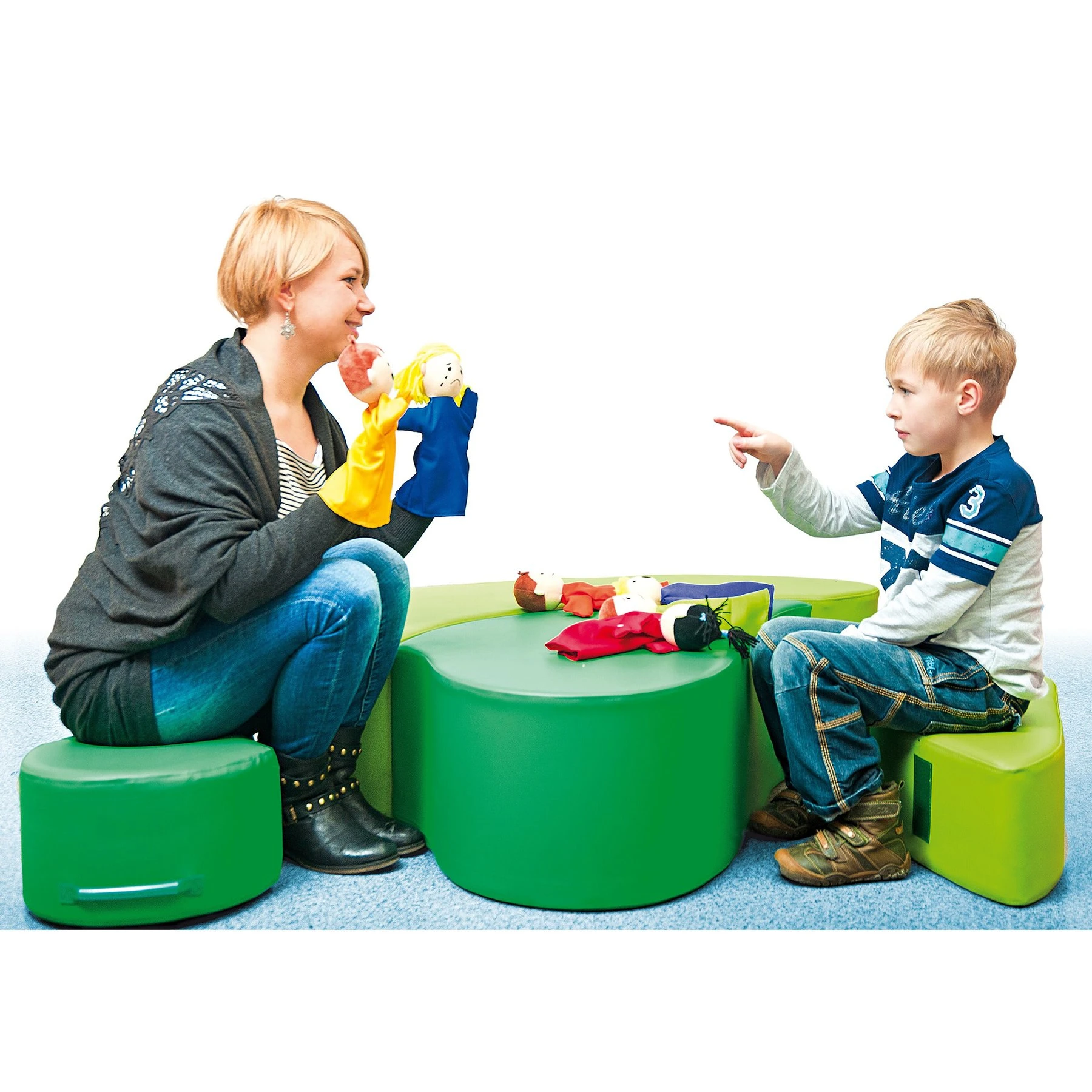 Докато децата изпълняват своите постановки с куклите за ръка, те опознават и разбират света на емоциите. Изразяването на собствените емоции с помощта на куклите помага за преодоляване на срамежливостта и комуникационните бариери. Всички кукли са направени от мека материя с плюшени елементи и седят здраво върху малките ръце.