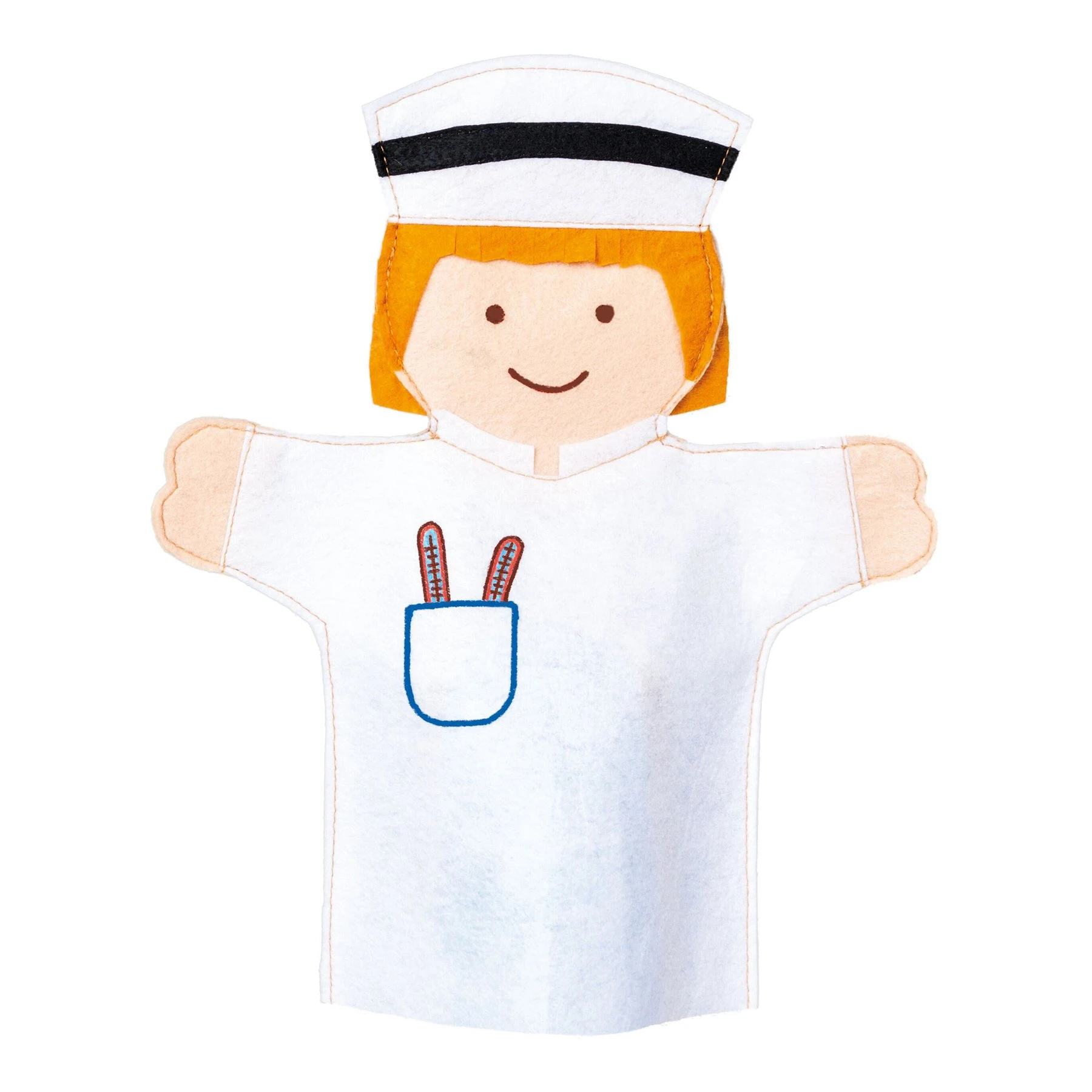 Комплект кукли за ръка, представляващи типични професии: фризьор, готвач, лекар, инженер, пожарникар, градинар, адвокат, автомеханик, медицинска сестра, полицай, пощальон, войник, учител, пилот.