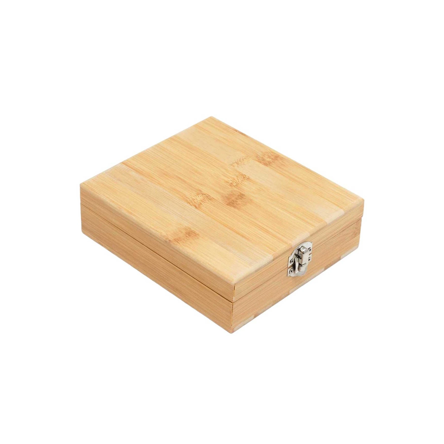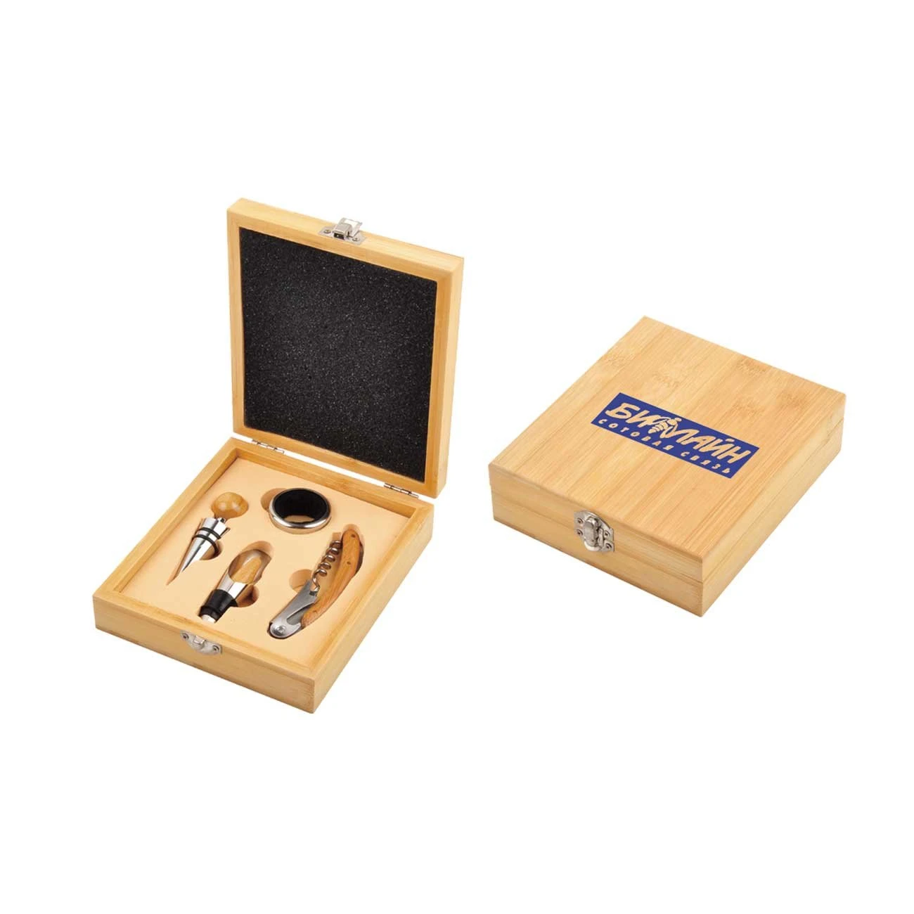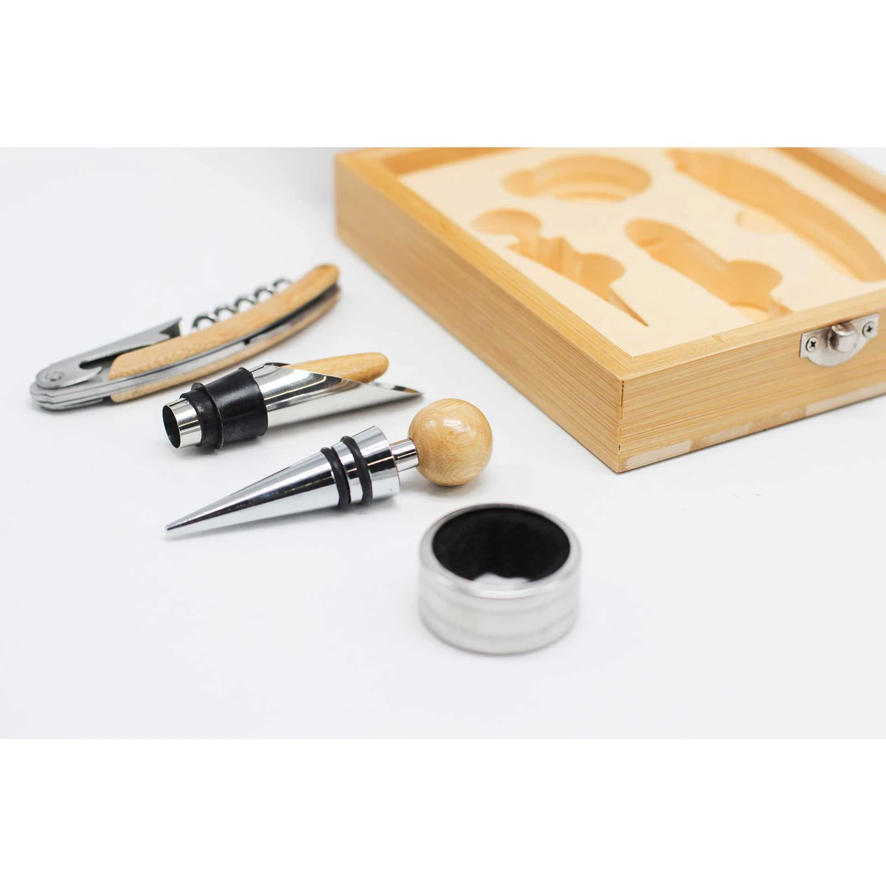 Комплект аксесоари за вино, подредени в елегантна дървена кутия.