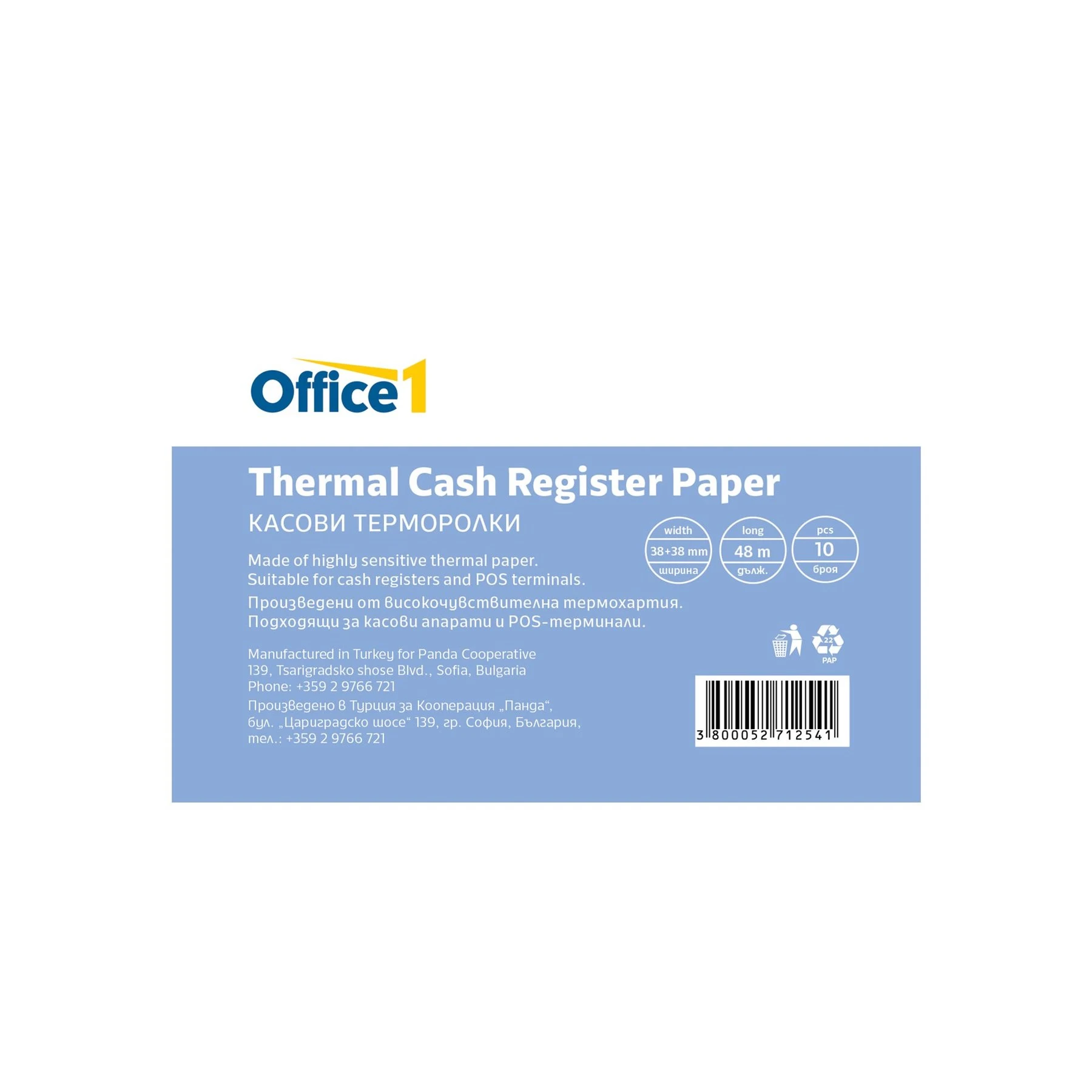 Office 1 Касова ролка, термо, широчина 38+38 mm, диаметър 48 m, 10 броя