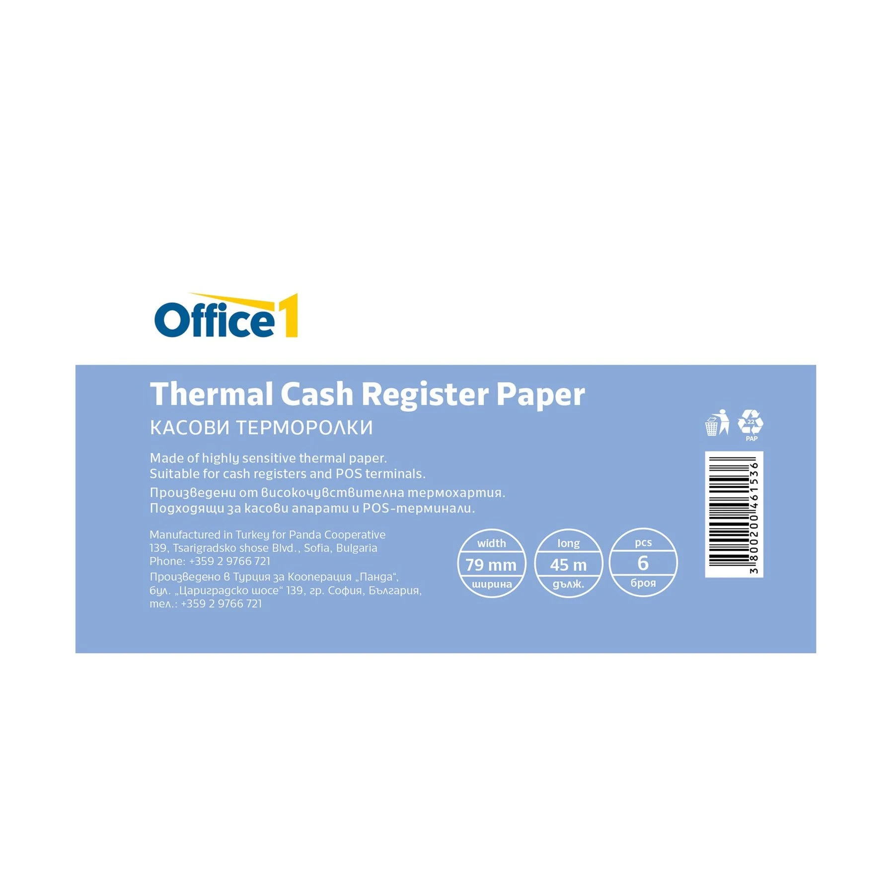 Office 1 Касова ролка, термо, широчина 79 mm, дължина 45 m, 6 броя