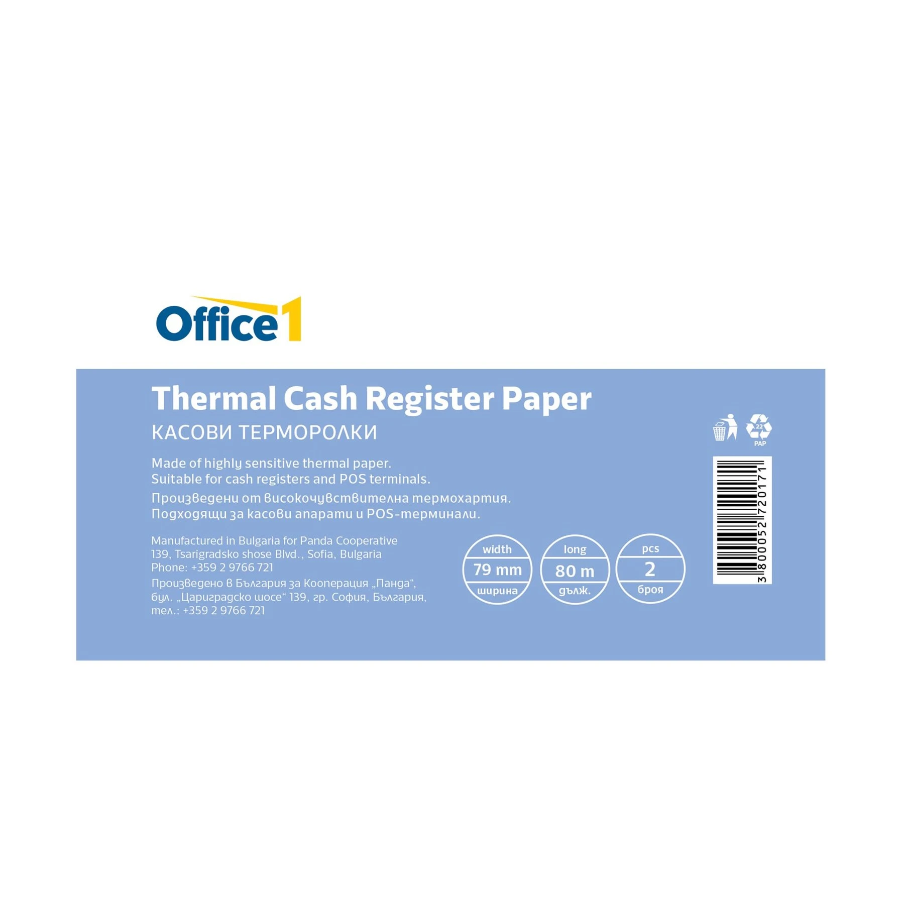 Office 1 Касова ролка, термо, широчина 79 mm, дължина 80 m, 2 броя