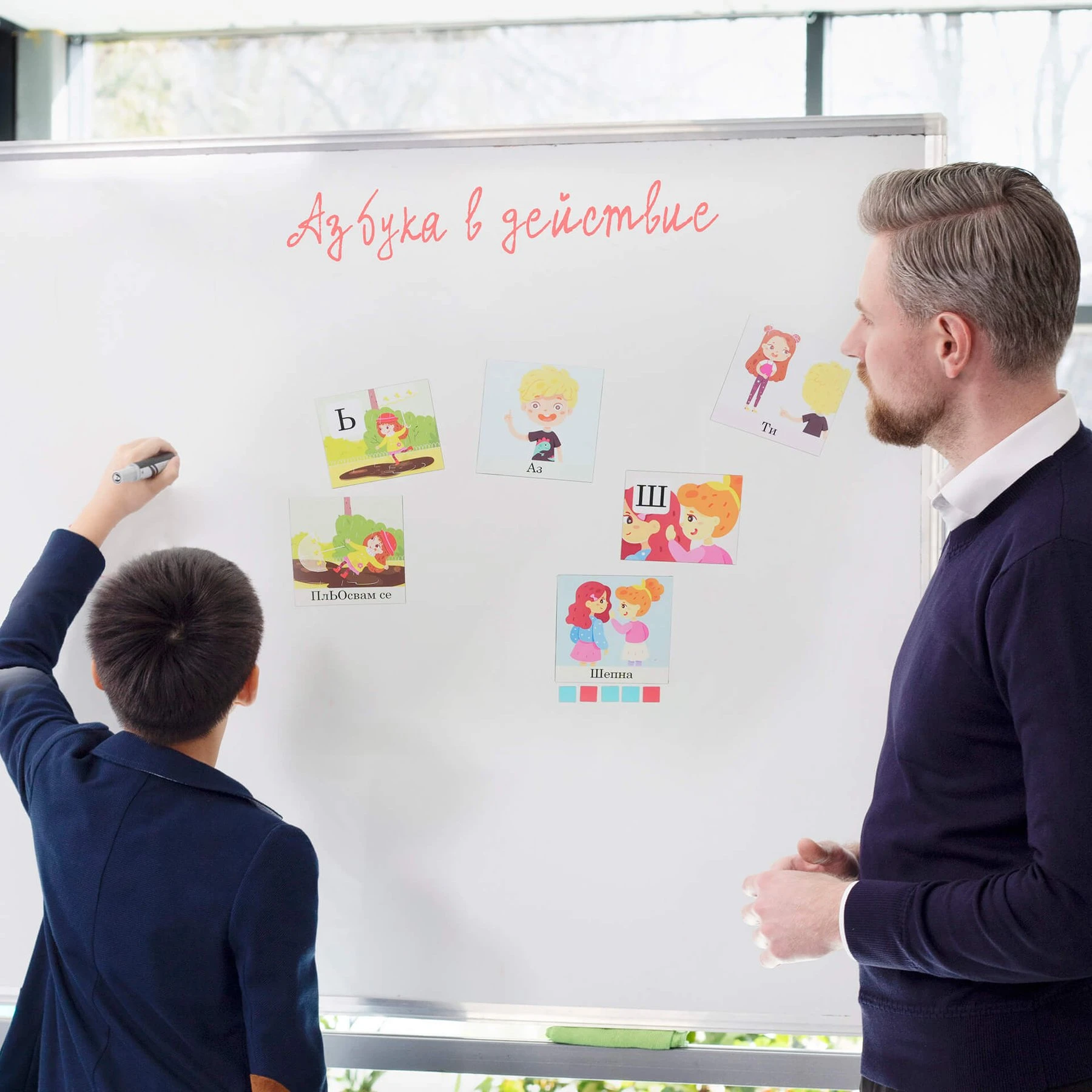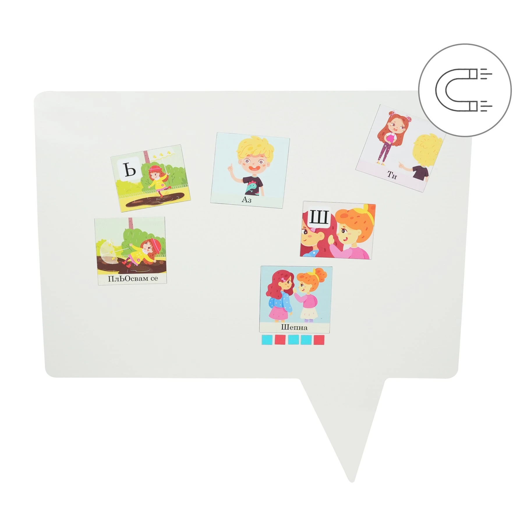 Образоветелен магнитен комплект "Азбука в действие" има за цел да затвърди познанията на децата за азбуката, да обогати речта, да запознае децата с понятието "действие" (глагол) и ролята на глагола при съставяне на изречение.