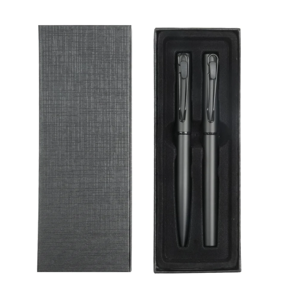 Луксозен комплект, включващ метална химикалка и ролер в черен цвят.