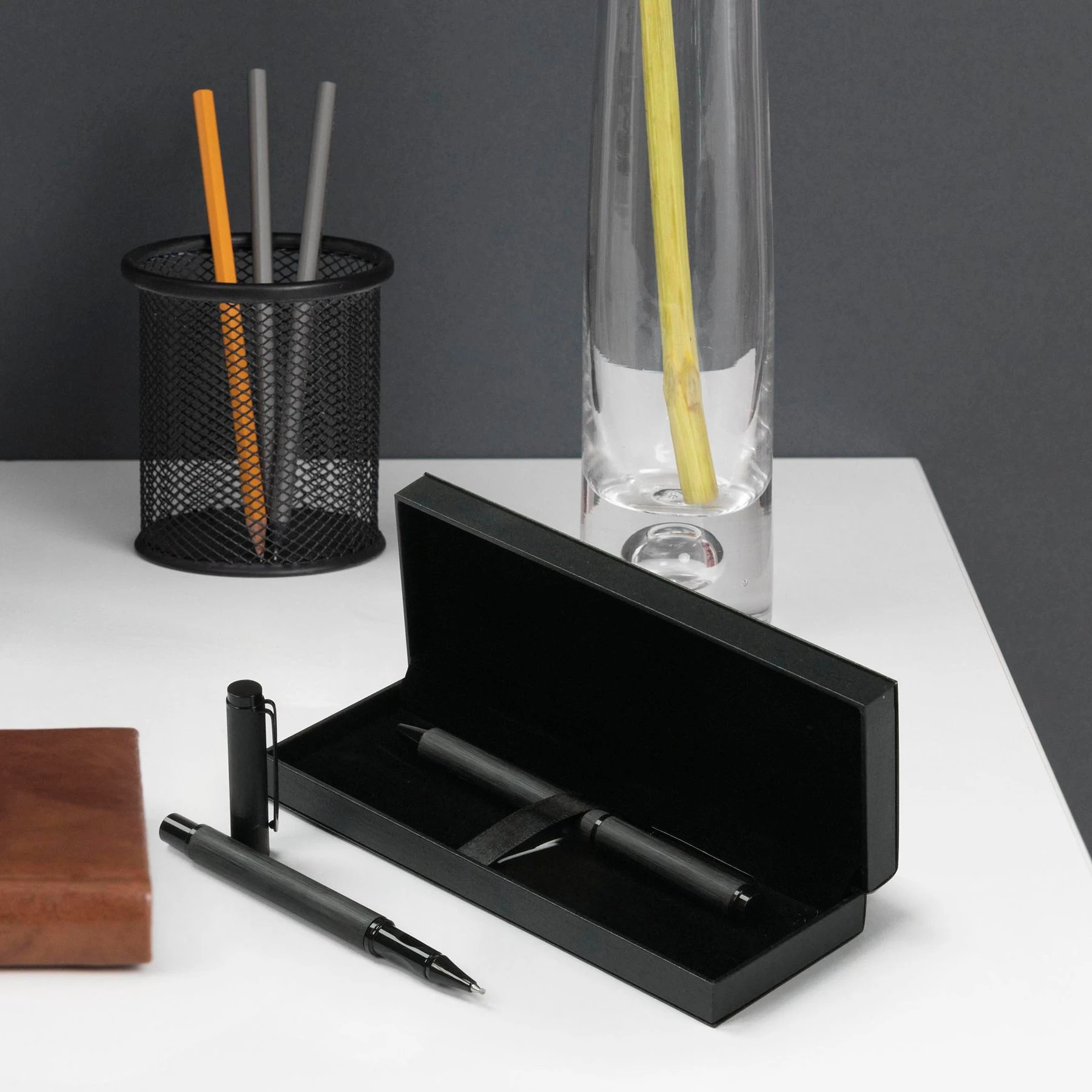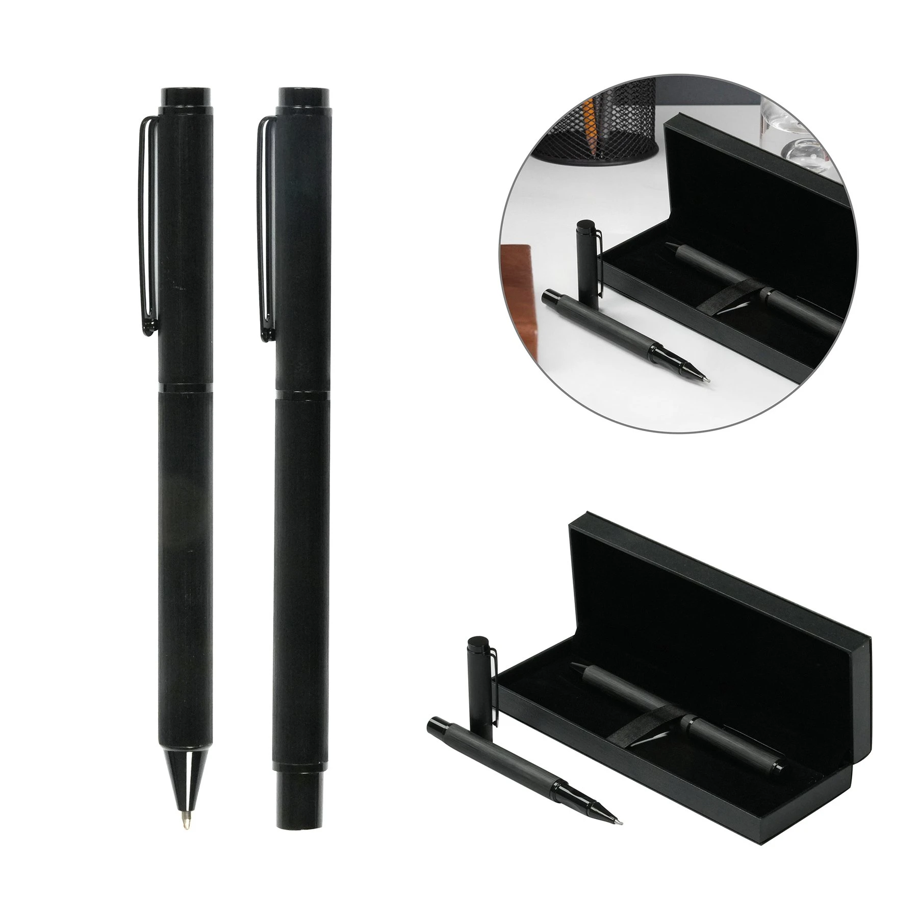 Комплектът включва химикалка и ролер в елегантна подаръчна кутия.
