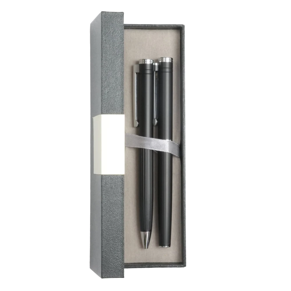 Стилен комплект, включващ метална химикалка и ролер в черен цвят.