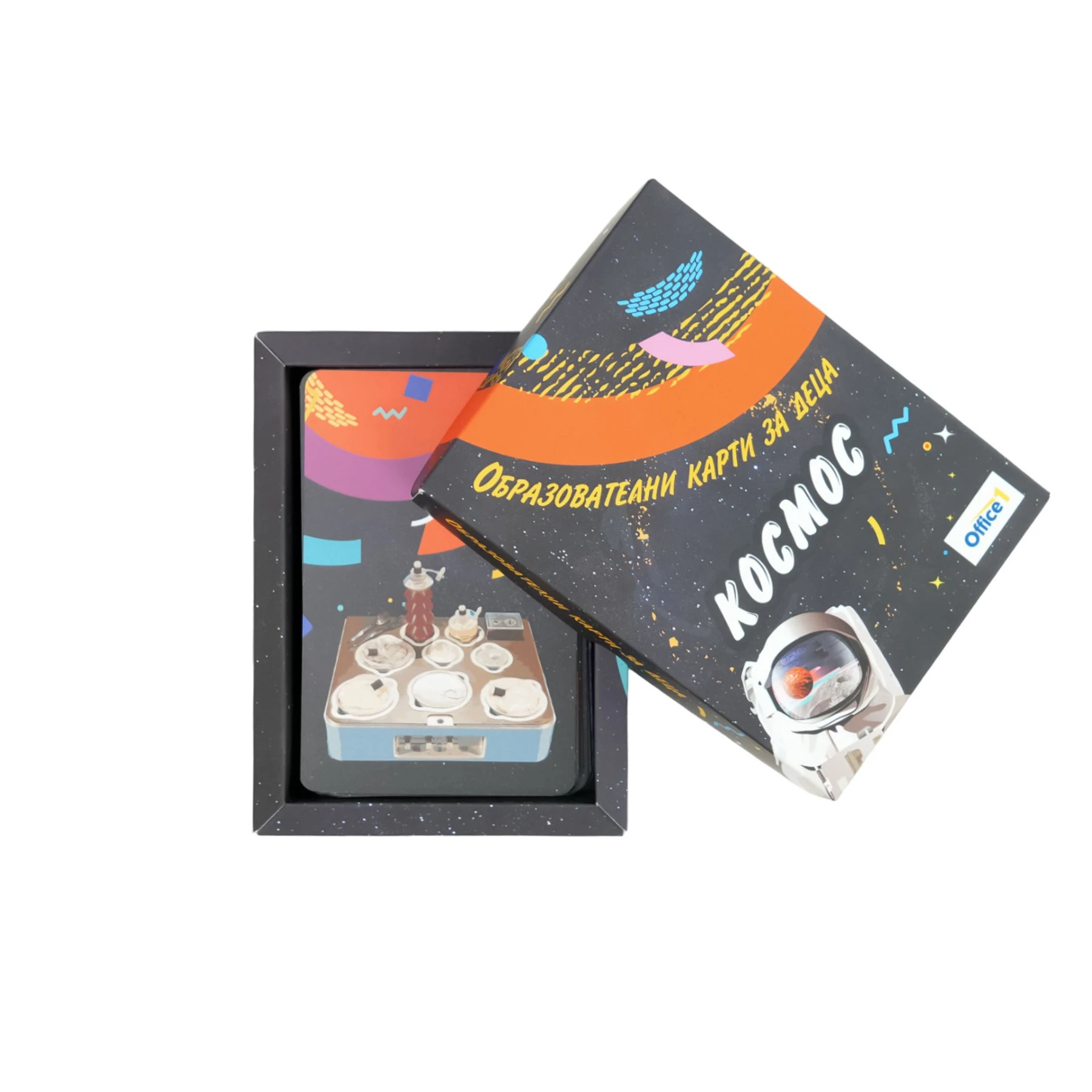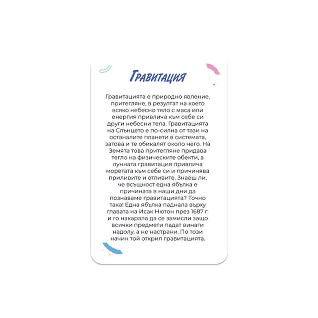 От едната страна на картите ще откриете прекрасни изображения, които ще оставят траен спомен в съзнанието на малките ни приятели, а от другата се крие любопитна информация за космическия обект, явление или изобретение.
