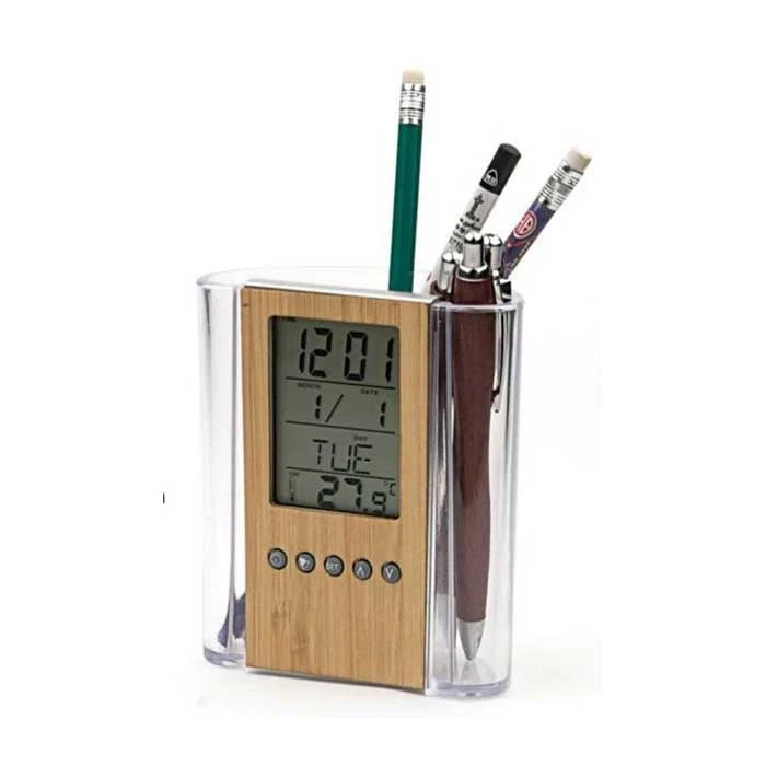 Бамбуков електронен часовник с дисплей за температура и дата TOP, с включен държач за химикалка.