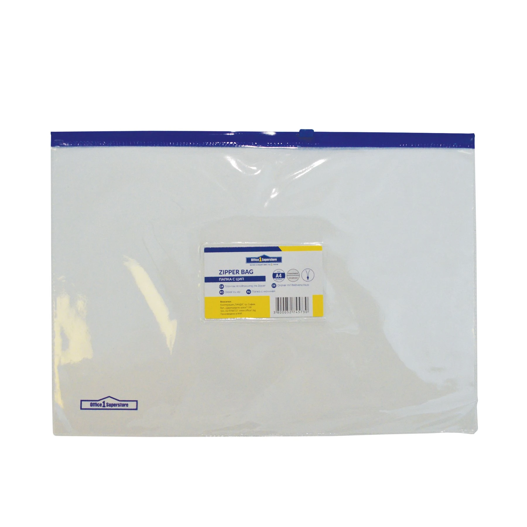 Office 1 Папка със син цип и джоб за визитка, А4, прозрачна