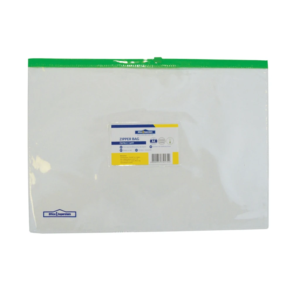 Office 1 Папка със зелен цип и джоб за визитка, А4, прозрачна