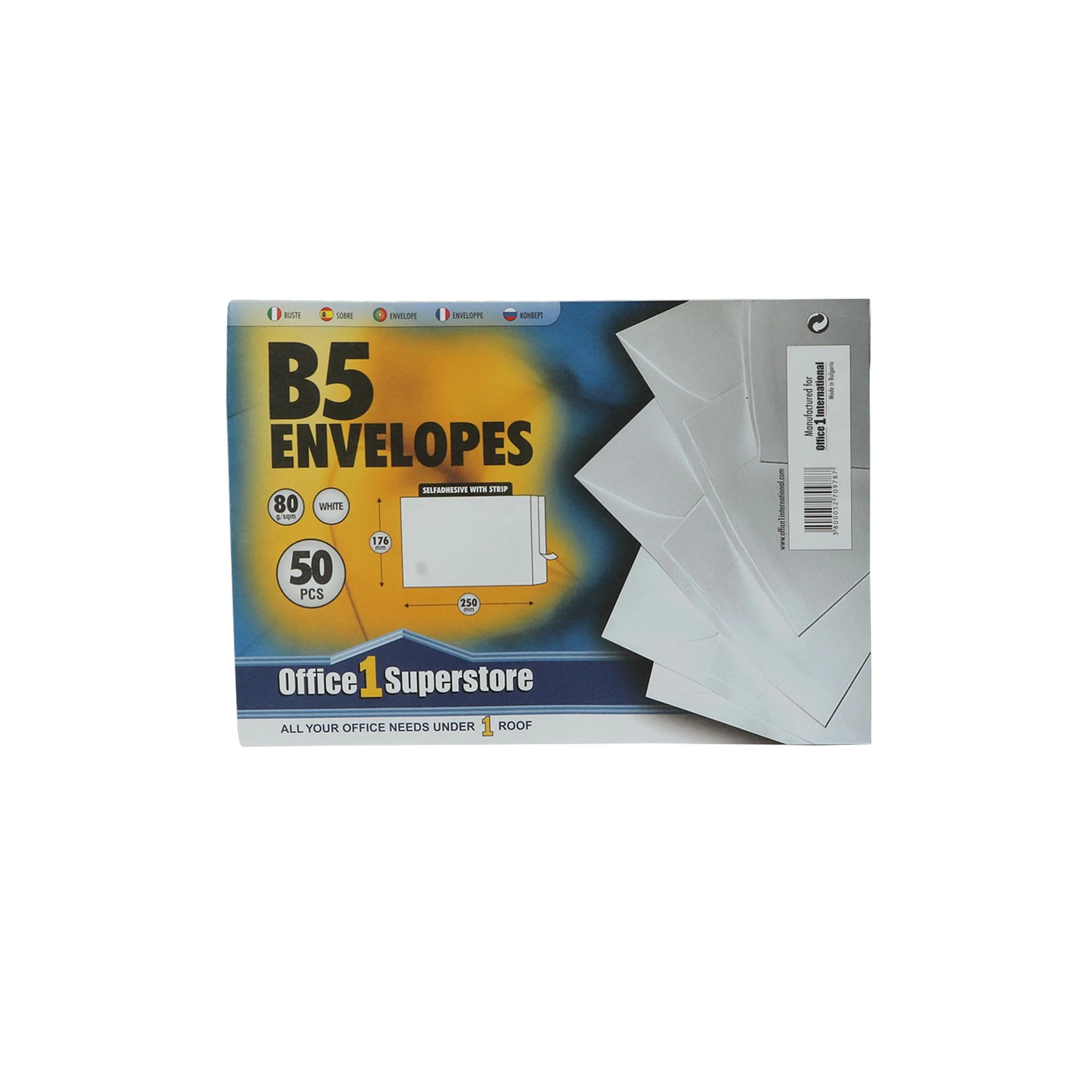 Office 1 Плик, B5, 175 x 250 mm, хартиен, със самозалепваща лента, бял, 50 броя