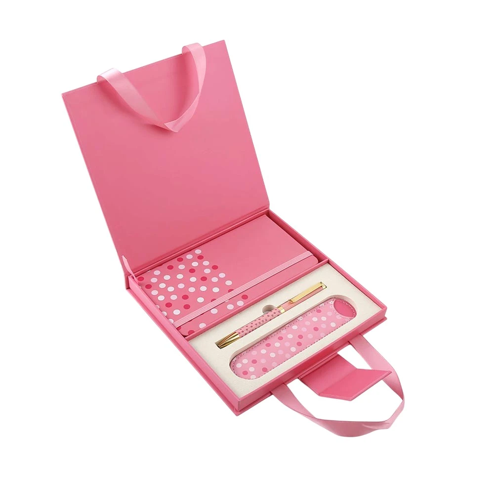 Комплектът включва елегантен тефтер във формат A6, метална химикалка с позлатени акценти и калъф в същия дизайн, подредени в луксозна розова кутия с панделка и дръжка за носене.