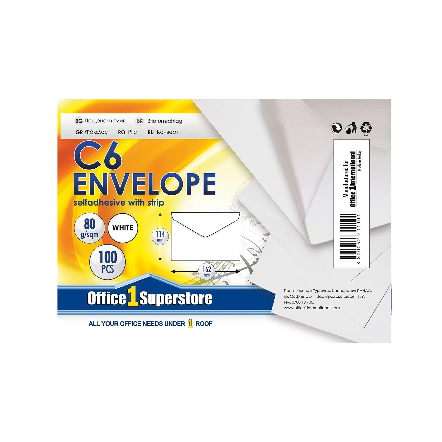 Office 1 Пощенски плик, C6, 114 x 162 mm, хартиен, с триъгълен капак, бял, 100 броя