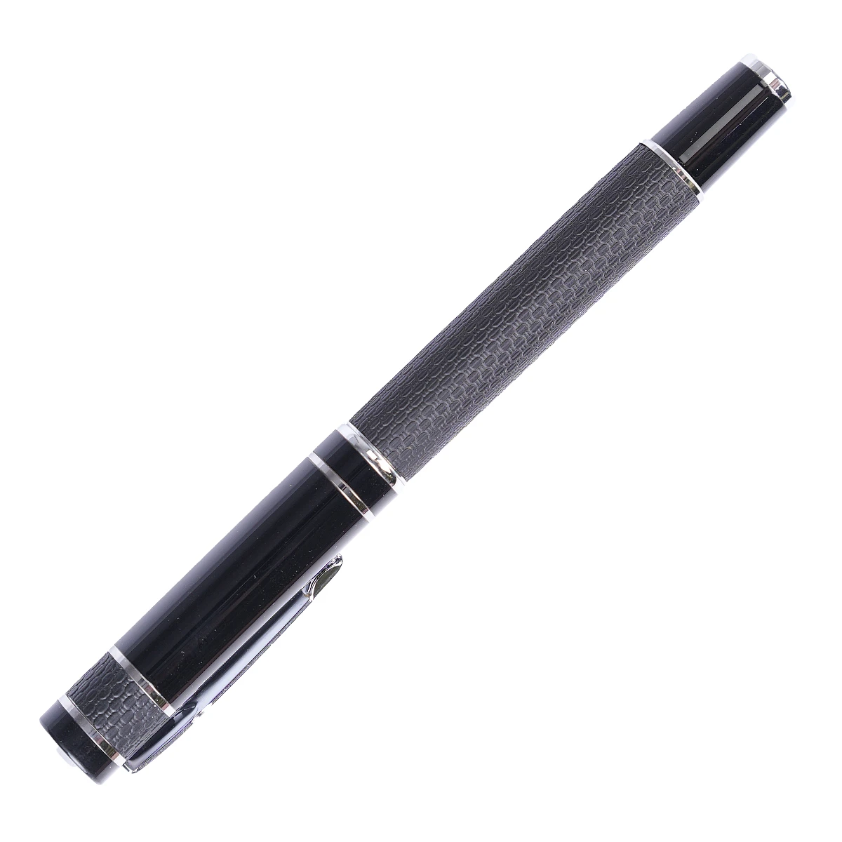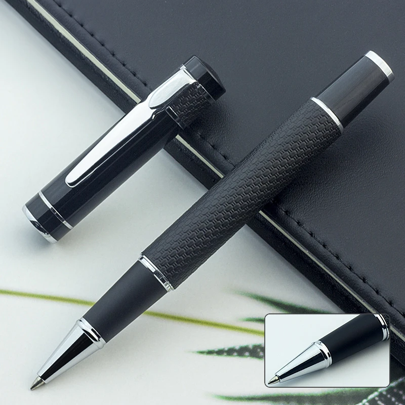 Луксозен ролер с черна кожена обвивка и метален корпус.
