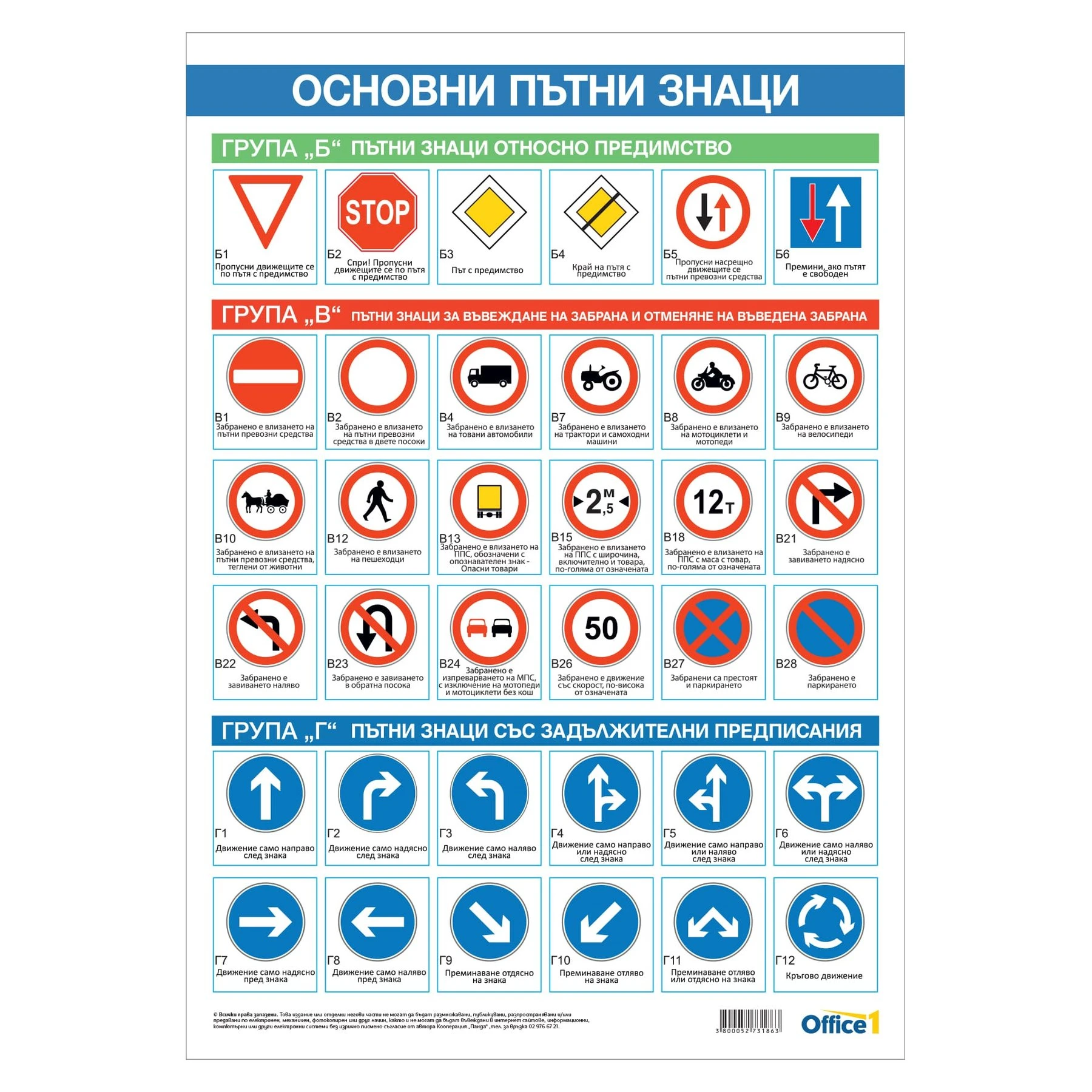 Ламинирано ученическо табло без лайстни "Безопасност на движението - основни пътни знаци".