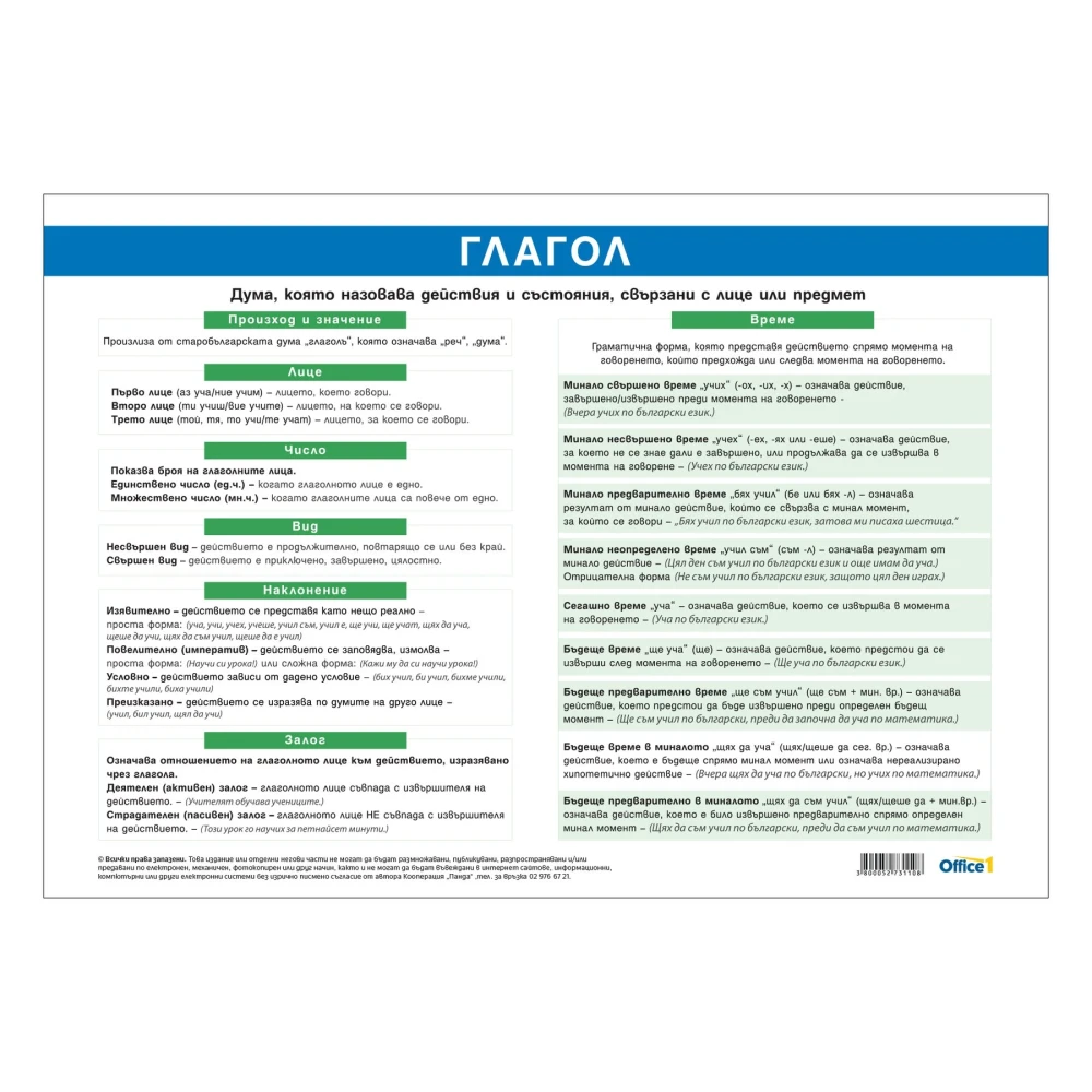 Ученическото табло съдържа важна информация за видовете глаголи и техните времена.