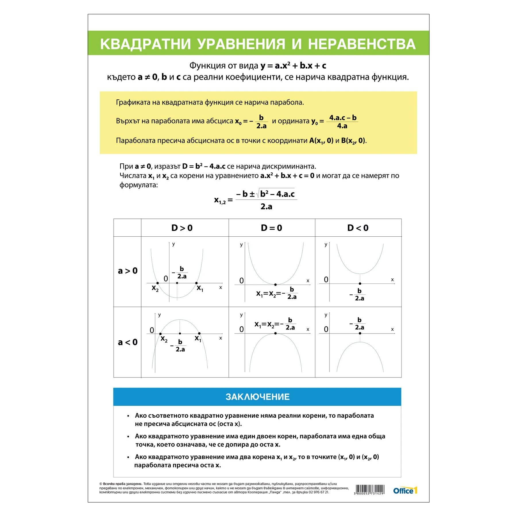 Office 1 Ученическо табло ''Квадратни уравнения и неравенства'', 70 x 100 cm, двустранно