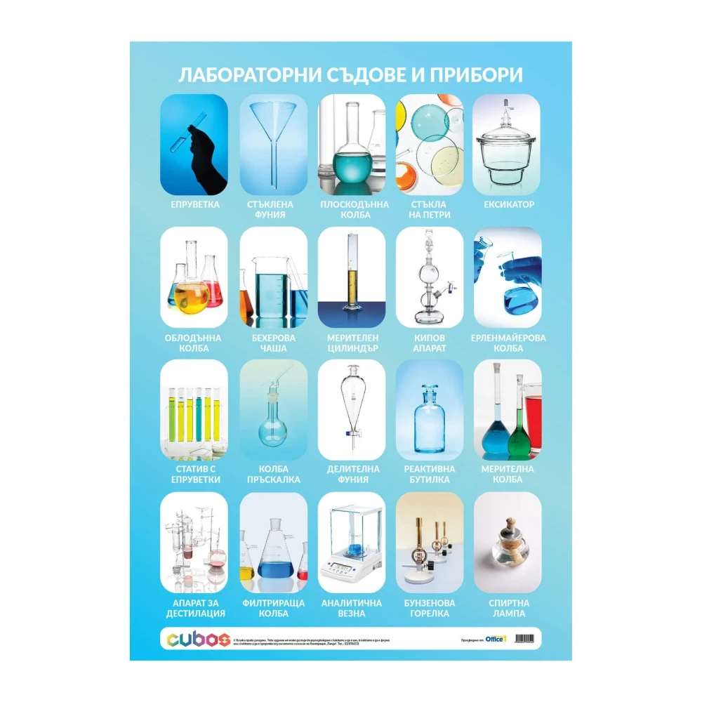 Таблото представя основните съдове и прибори, които се използват в химическата лаборатория.