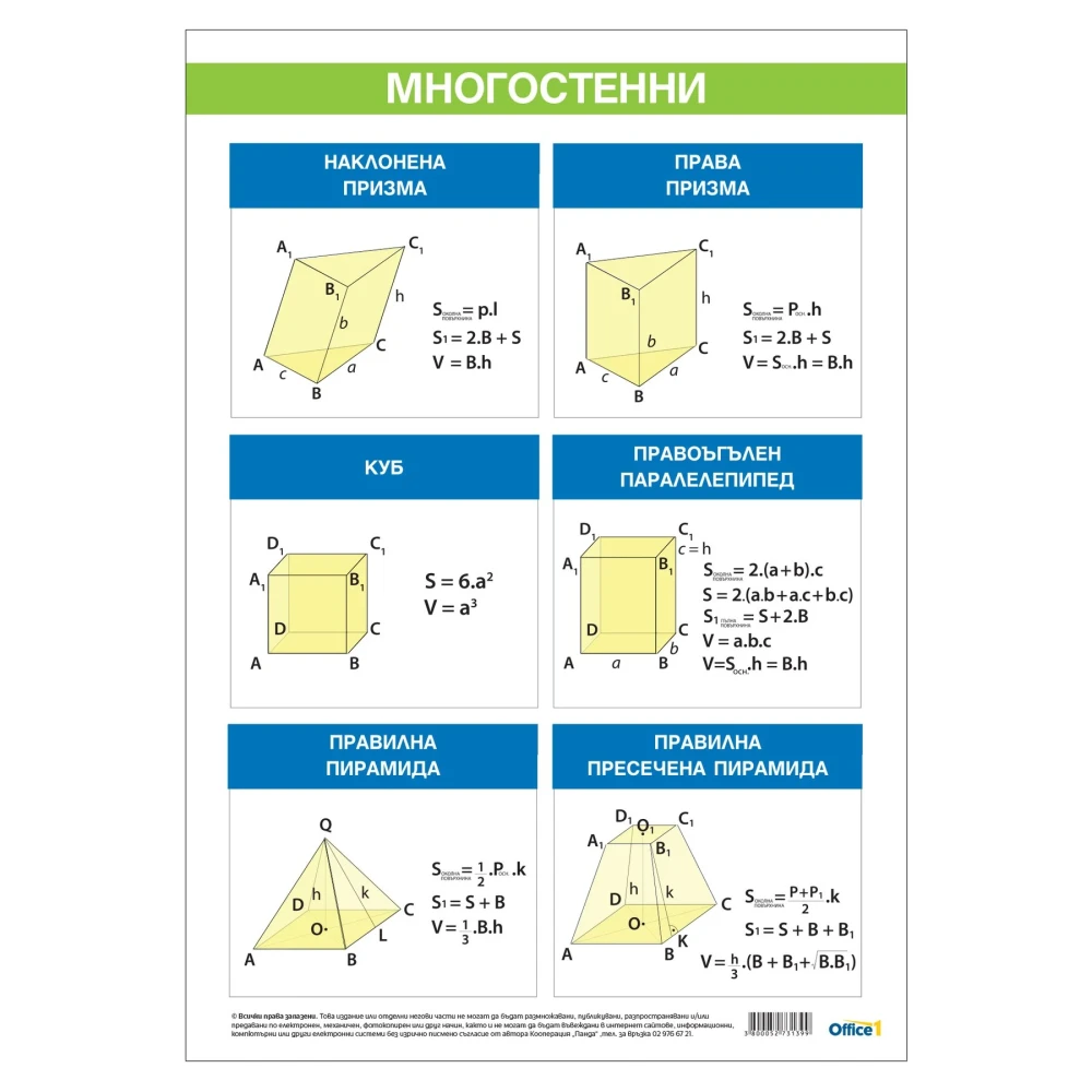 Ученическо табло ''Многостени''. Съдържа формули за решаване на задачи.