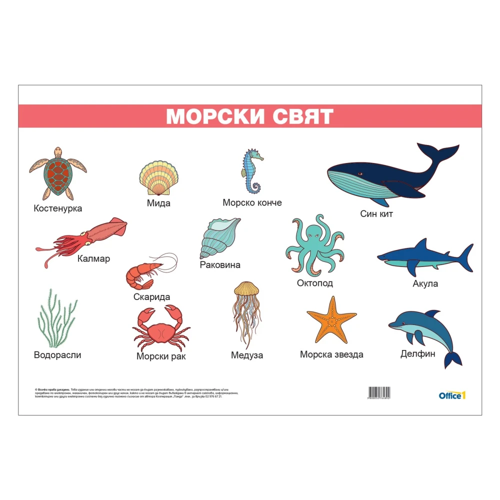 Office 1 Ученическо табло ''Морски свят'', ламинирано, 50 x 70 cm, модел 1