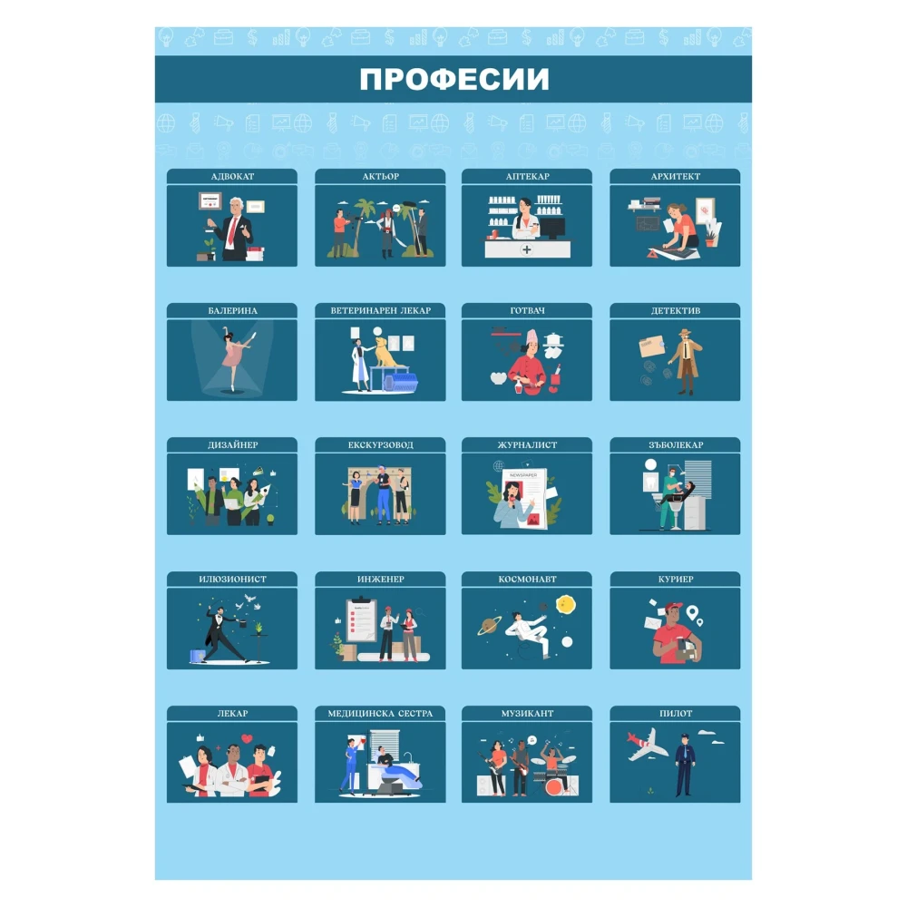 Двустранно ламинирано учебно табло. В него са изобразени някои от най-разпространените професии.
