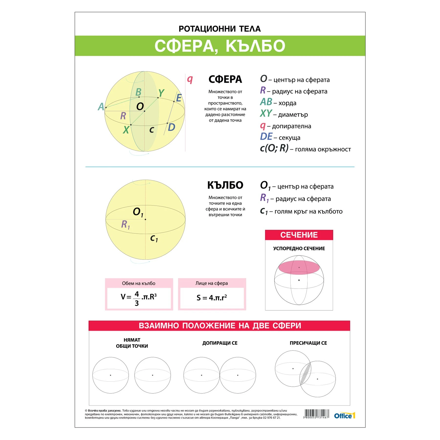 Двустранно ученическо табло ''Пресечен конус / сфера''. Съдържа информация за изобразените фигури, техните формули и сечения.