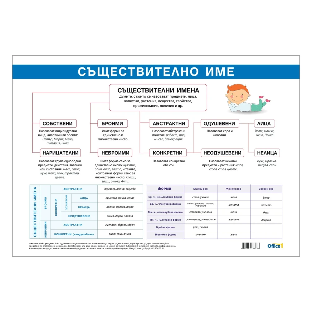 Ученическото табло съдържа важна информация за съществителното име и неговите правописни правила.