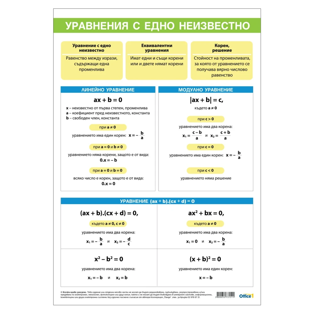 Ламинирано учебно табло ''Уравнения с едно неизвестно''. Подходящо е за часовете по математика.