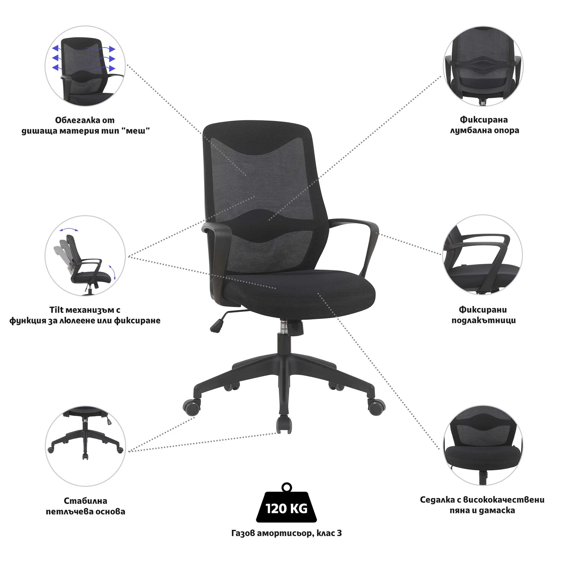 Офис стол RFG Sven W, дамаска и меш, Tilt механизъм, до 120 kg, черен